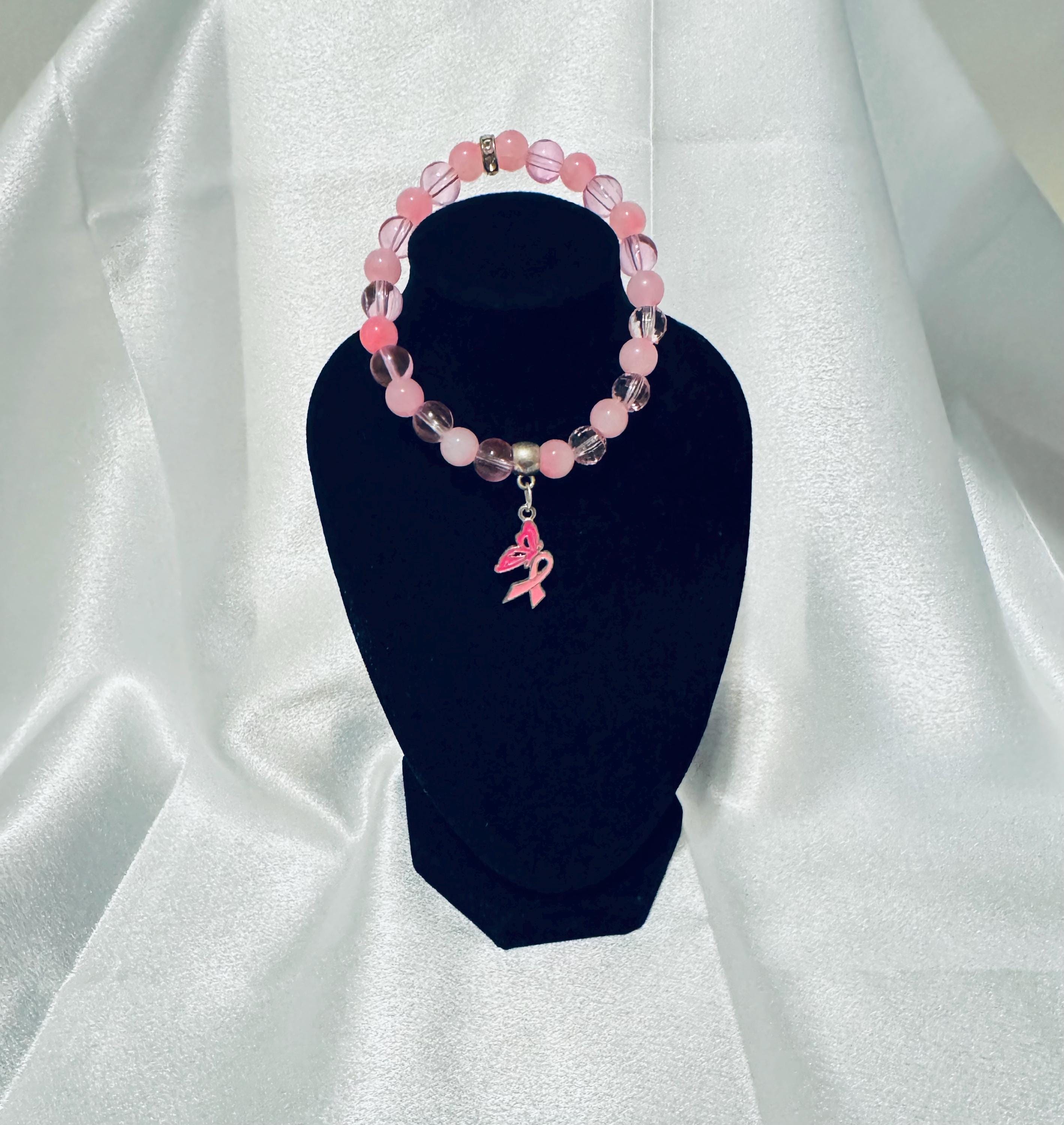 Honor every journey—your own or that of someone you love—with this meaningful Breast Cancer Awareness stretch bracelet. Handmade with acrylic and glass beads and finished with a symbolic charm, it’s a beautiful way to show support, spread hope, and keep awareness close at hand.