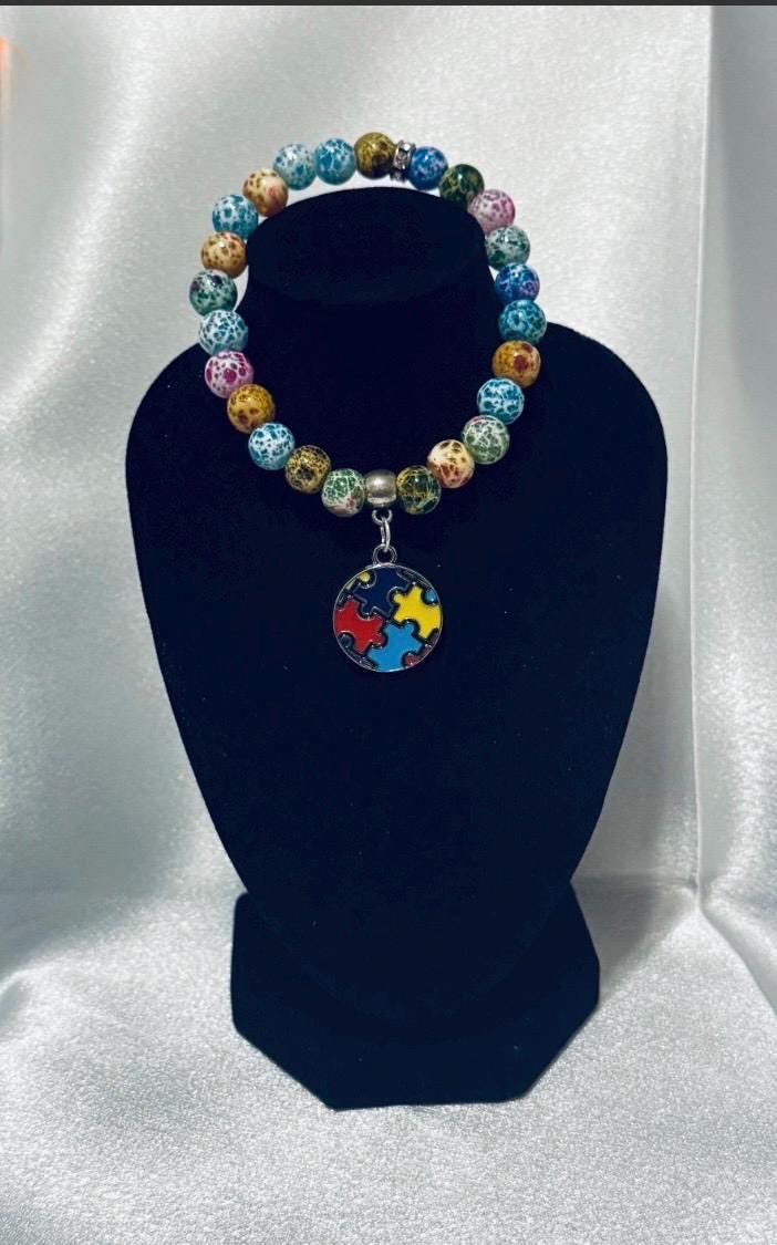 🧩 Show your support for Autism Awareness with this stretch acrylic and glass beaded charm bracelet.