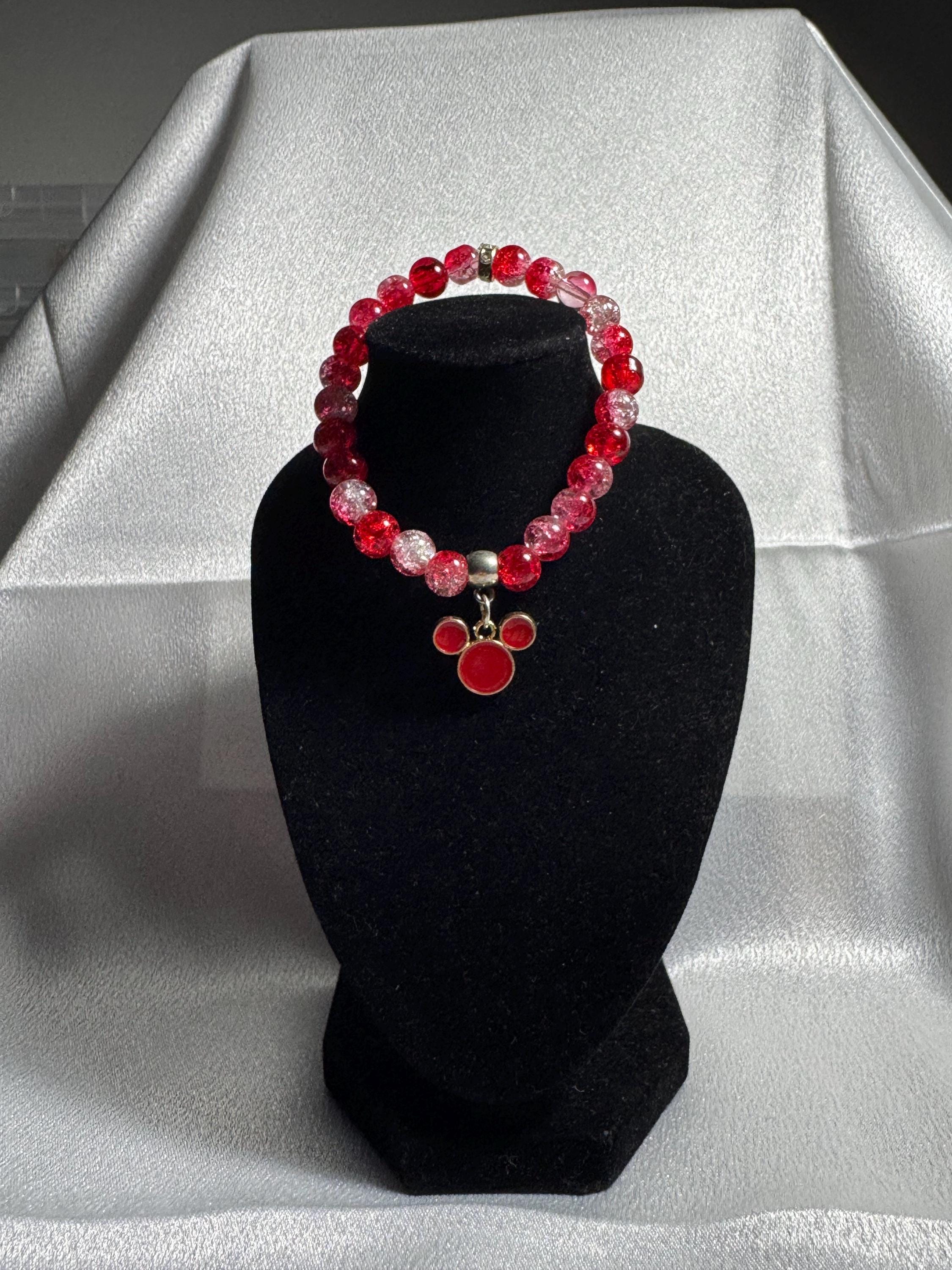 Add a touch of magic to your outfit with this handmade Mickey‑inspired charm bracelet, crafted with colorful acrylic and glass beads on a comfortable stretch band. Perfect for Disney fans of all ages, this bracelet measures approximately 7.5 inches and can be customized in both size and color to match your unique style.