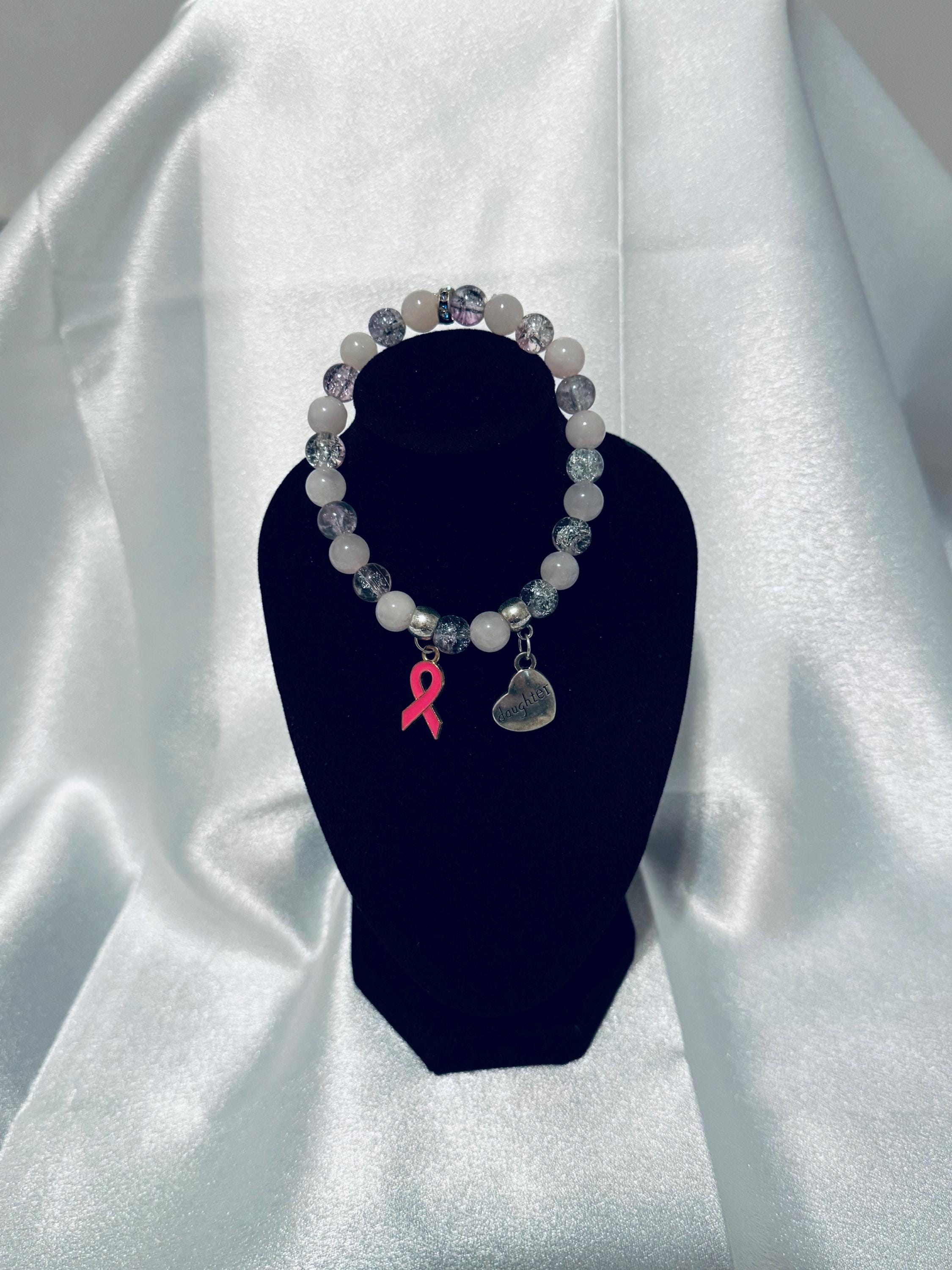 Honor every journey—your own or that of someone you love—with this meaningful Breast Cancer Awareness stretch bracelet. Handmade with acrylic and glass beads and finished with a symbolic charm, it’s a beautiful way to show support, spread hope, and keep awareness close at hand.