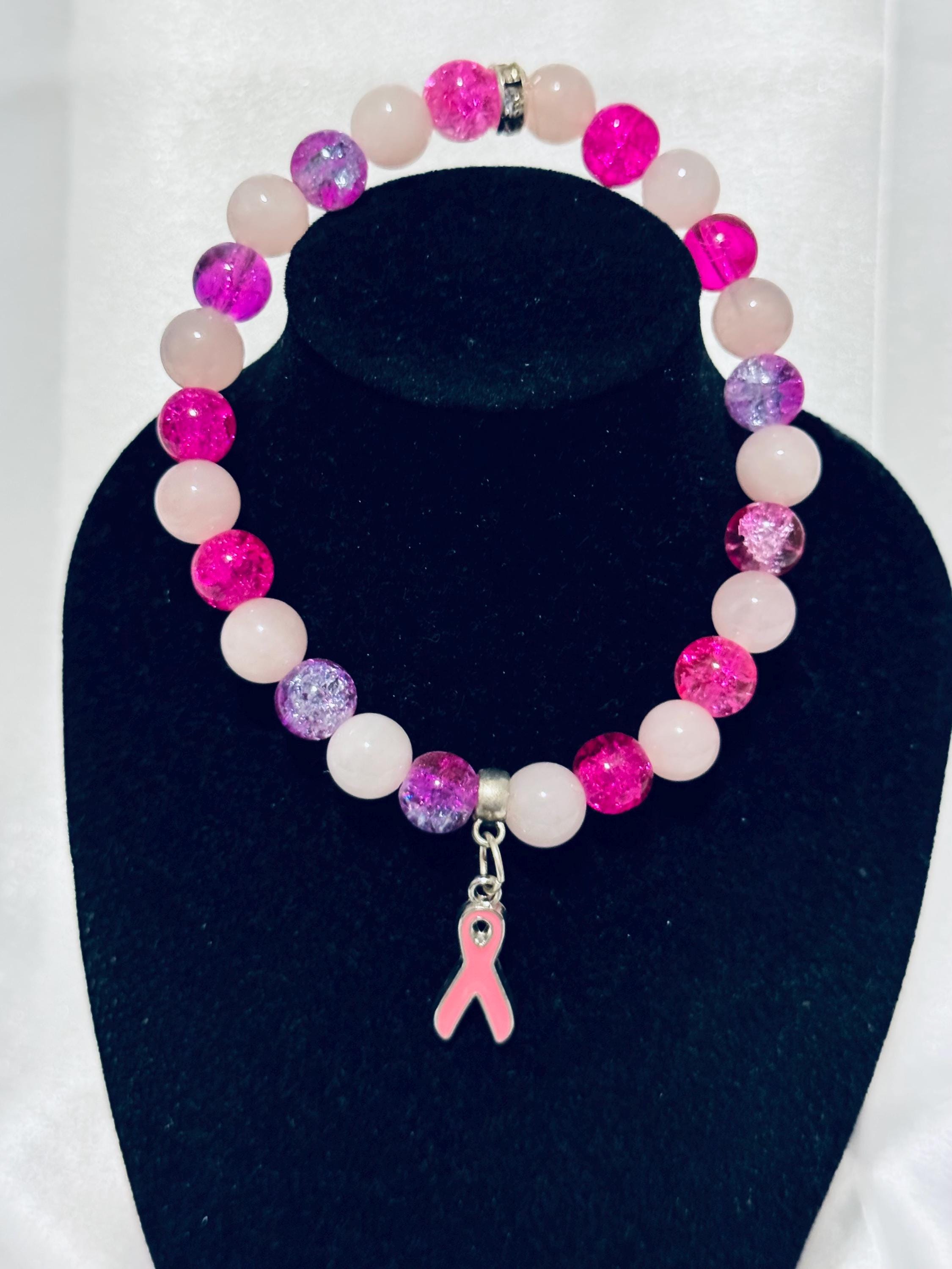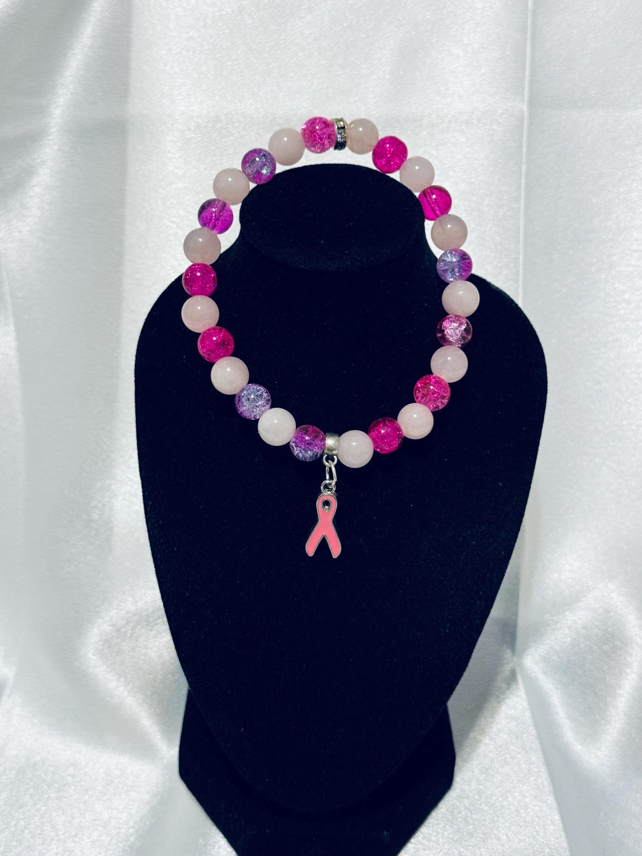 Honor every journey—your own or that of someone you love—with this meaningful Breast Cancer Awareness stretch bracelet. Handmade with acrylic and glass beads and finished with a symbolic charm, it’s a beautiful way to show support, spread hope, and keep awareness close at hand.