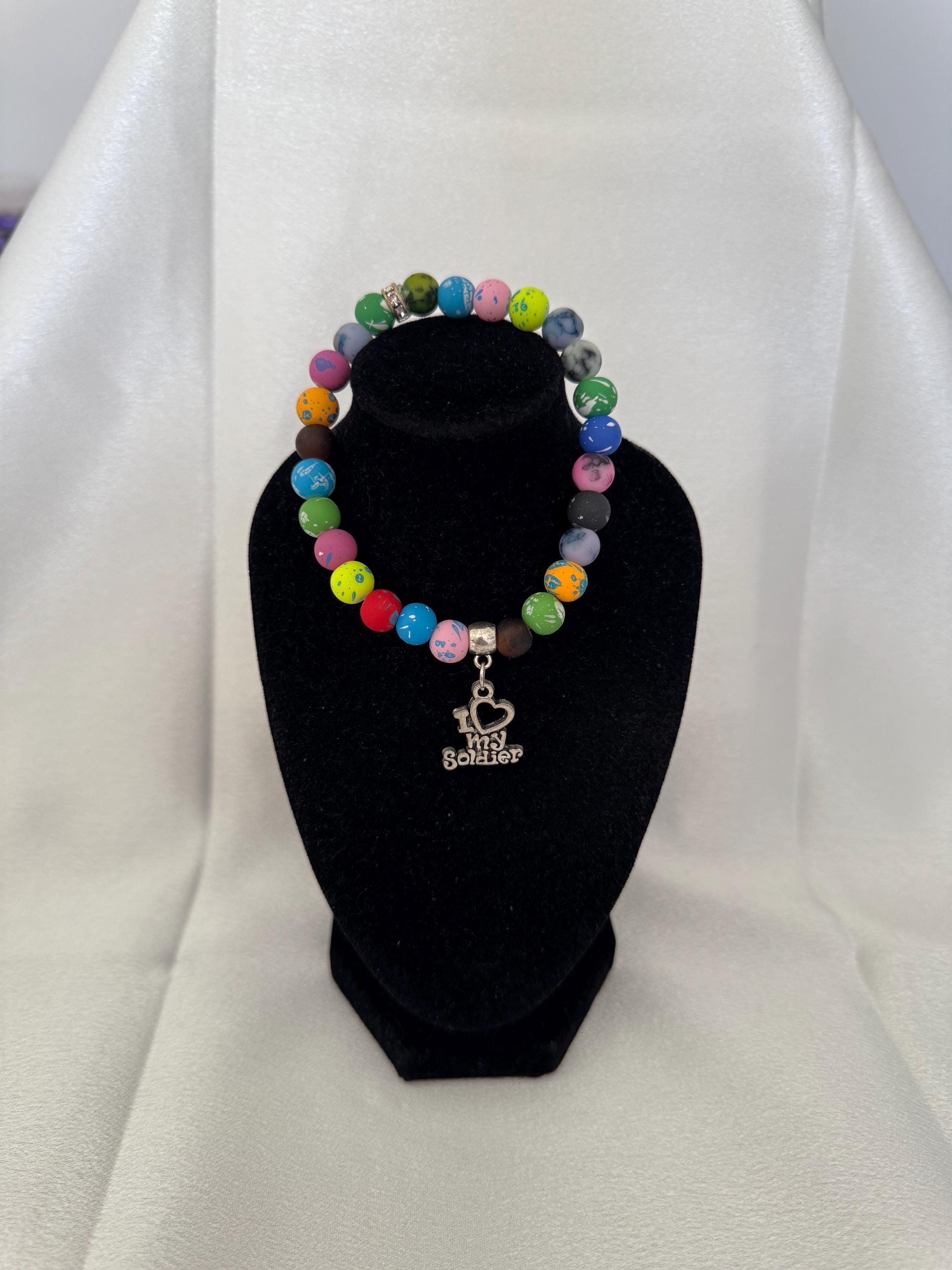 Celebrate your love for the USA with this handmade stretch bracelet, crafted with vibrant acrylic and glass beads and finished with a patriotic charm. Perfect for holidays like the Fourth of July, Memorial Day, Veterans Day, or simply showing your American pride yearโ€‘round. Measuring approximately 7.5 inches, it can also be customized in size and color to suit your style.