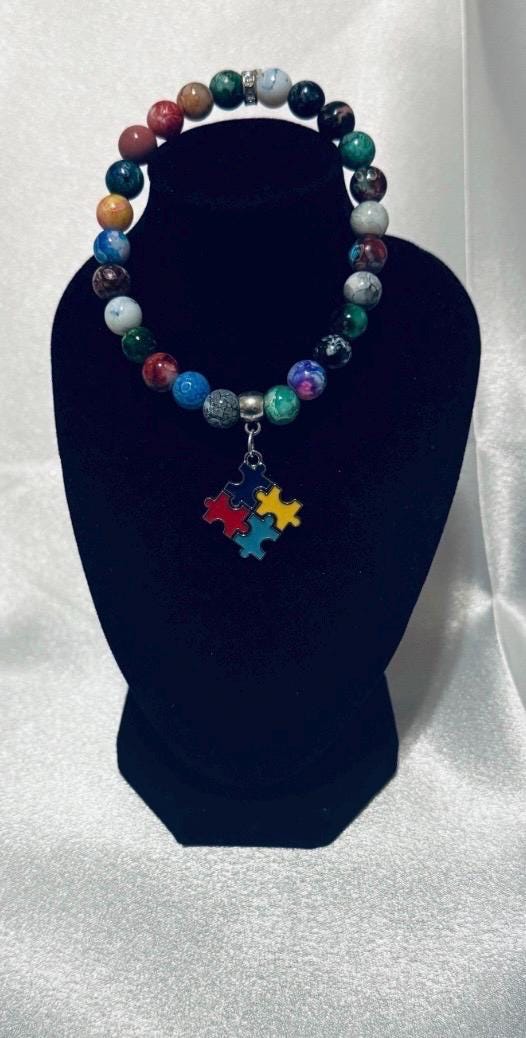 🧩 Show your support for Autism Awareness with this stretch acrylic and glass beaded charm bracelet.