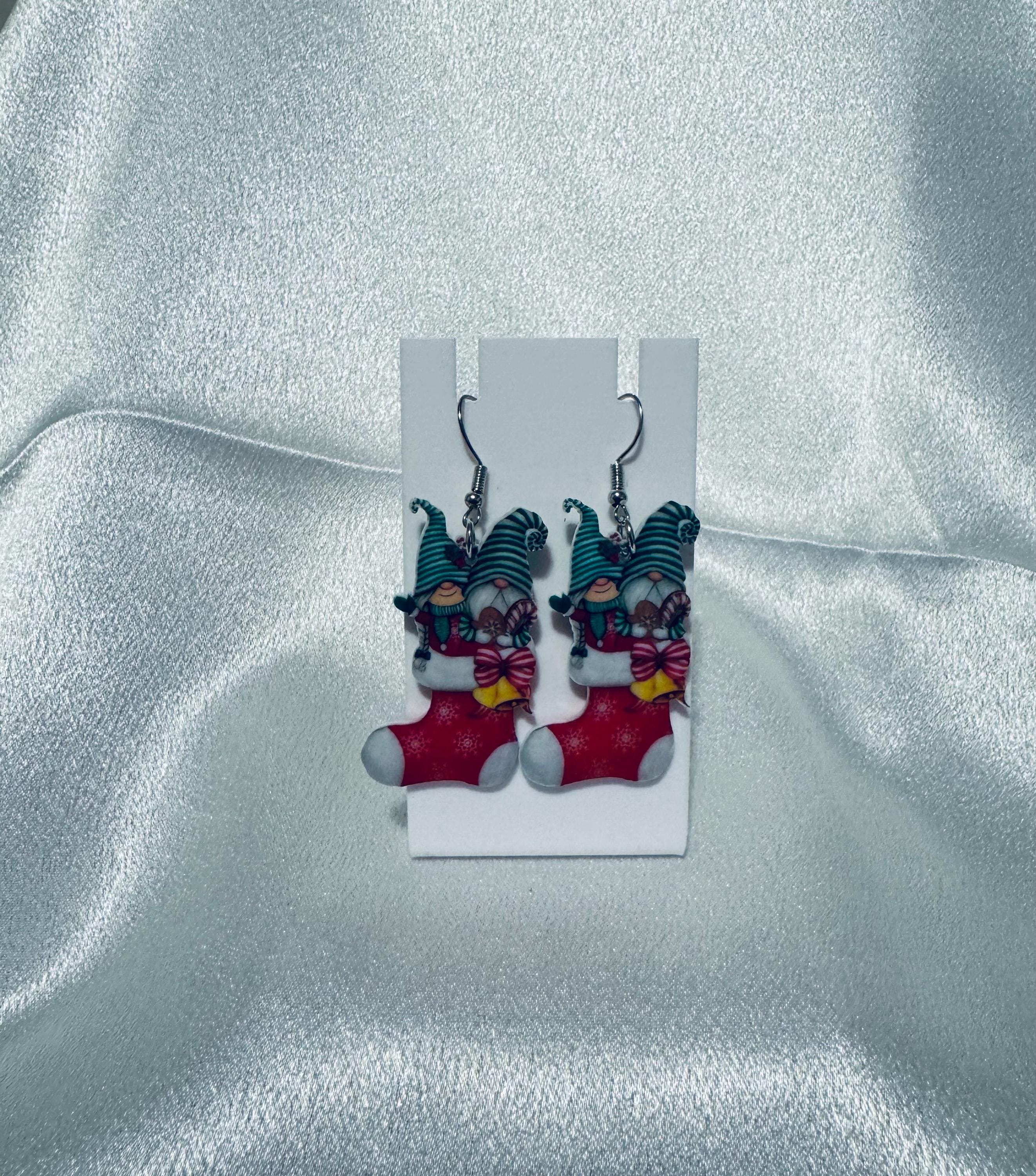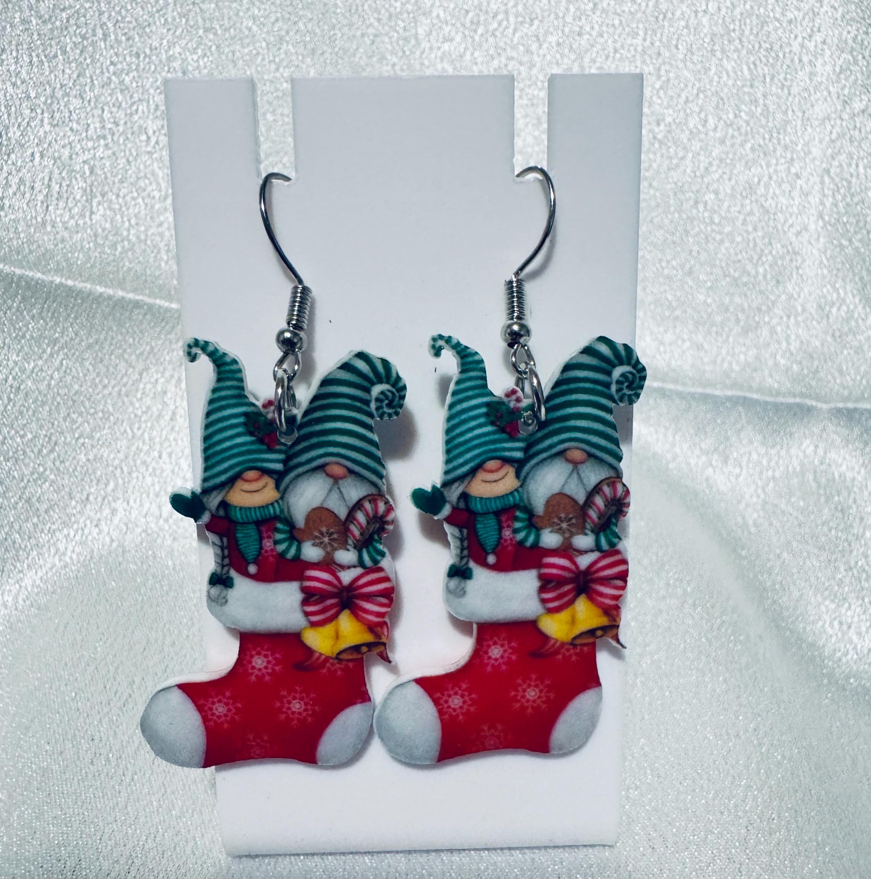 Wooden Christmas Gnomes In Stocking Dangle Earrings