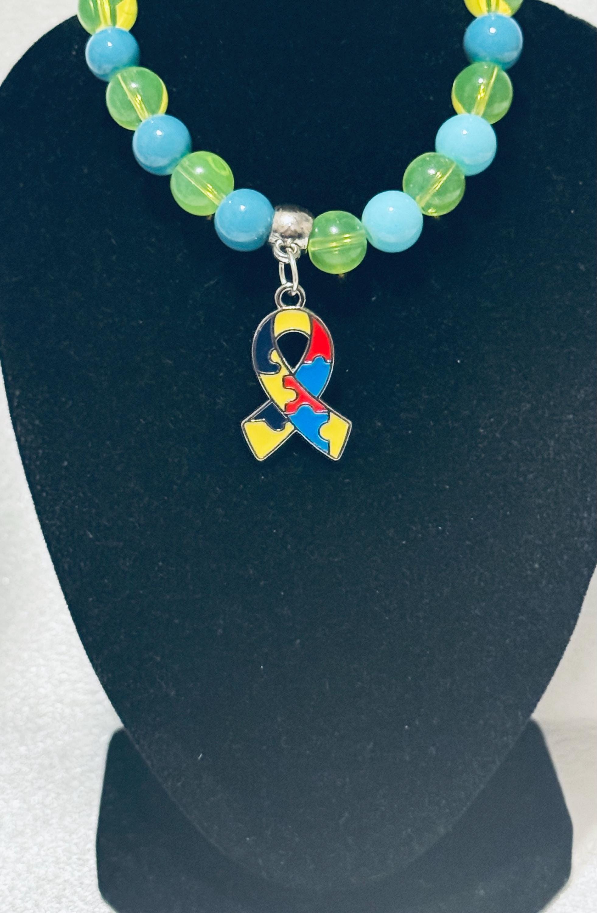This meaningful bracelet features a blend of acrylic and glass beads paired with an Autism Awareness charm, creating a thoughtful accessory that honors a cause close to the heart. It’s perfect as a gift or a special piece just for you.