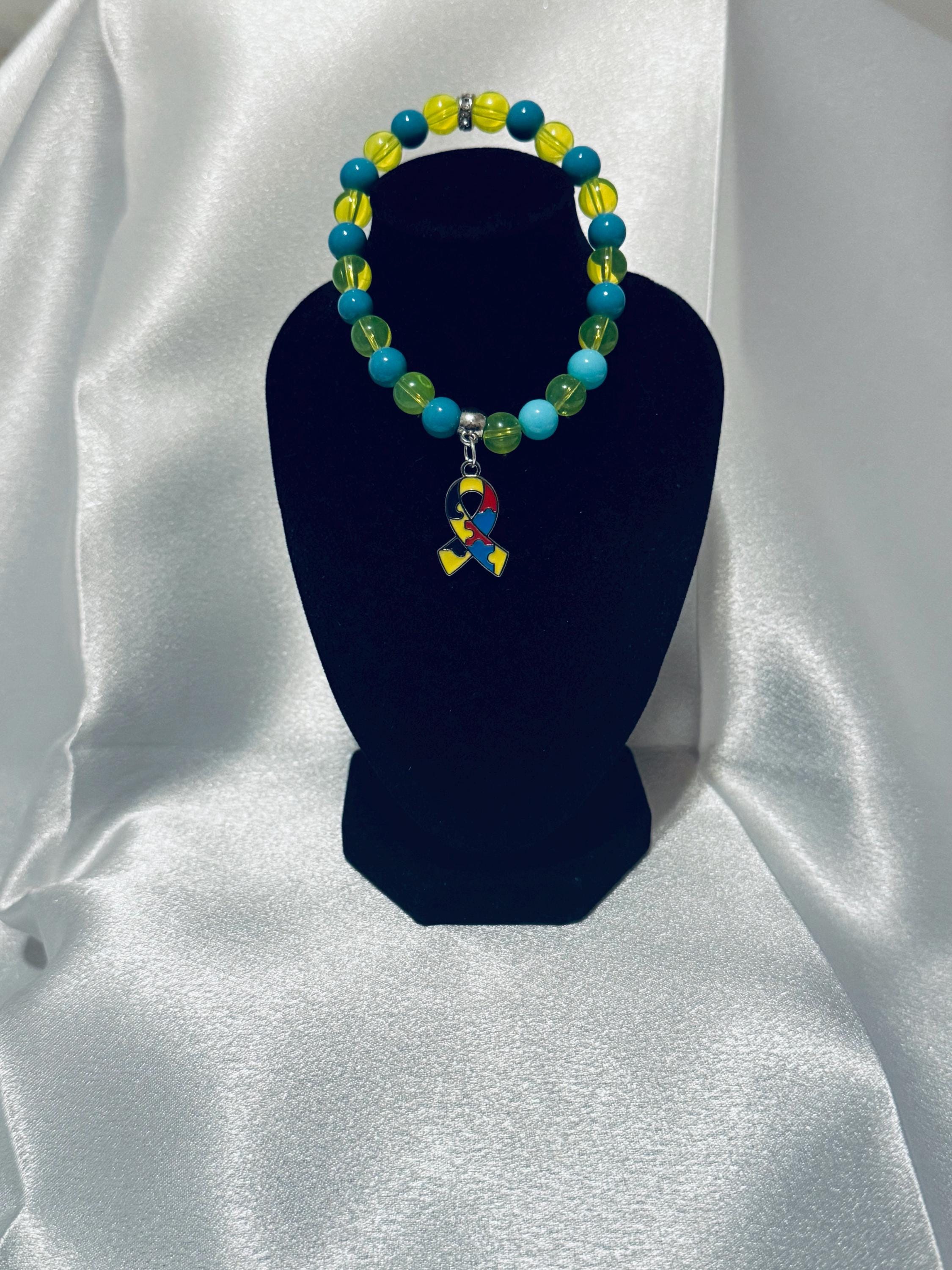 🧩 Show your support for Autism Awareness with this stretch acrylic and glass beaded charm bracelet.