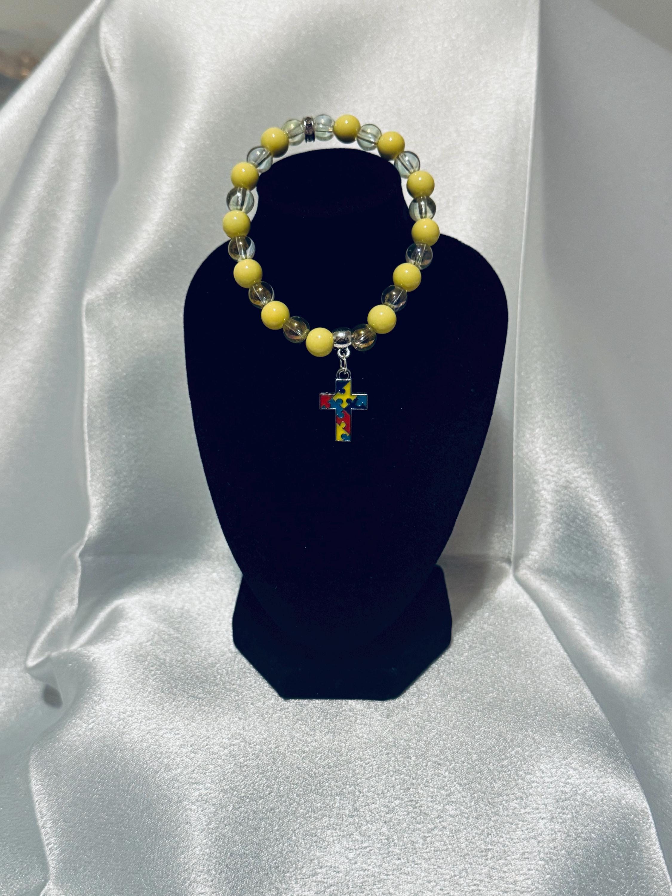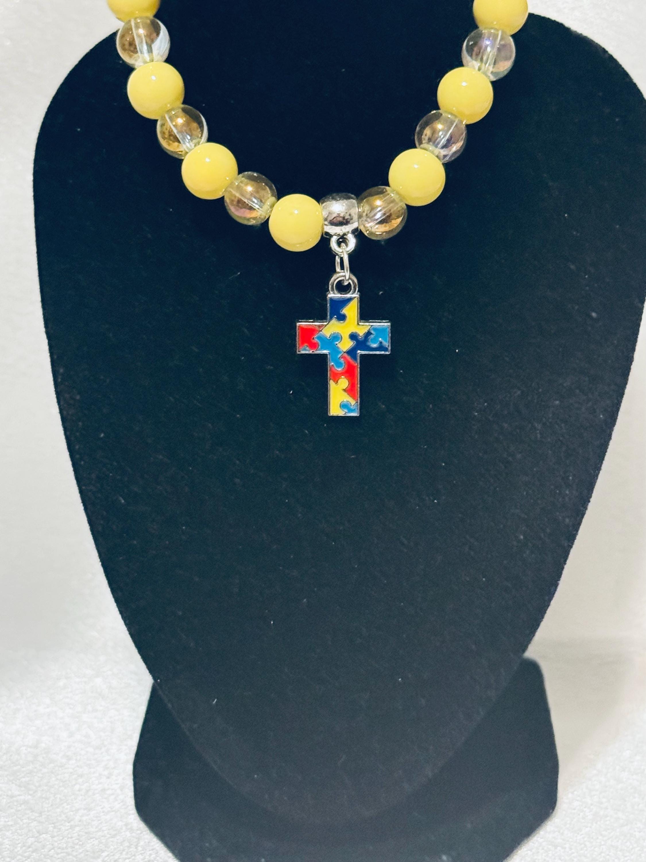 🧩 Show your support for Autism Awareness with this stretch acrylic and glass beaded charm bracelet.