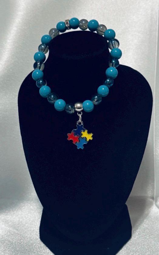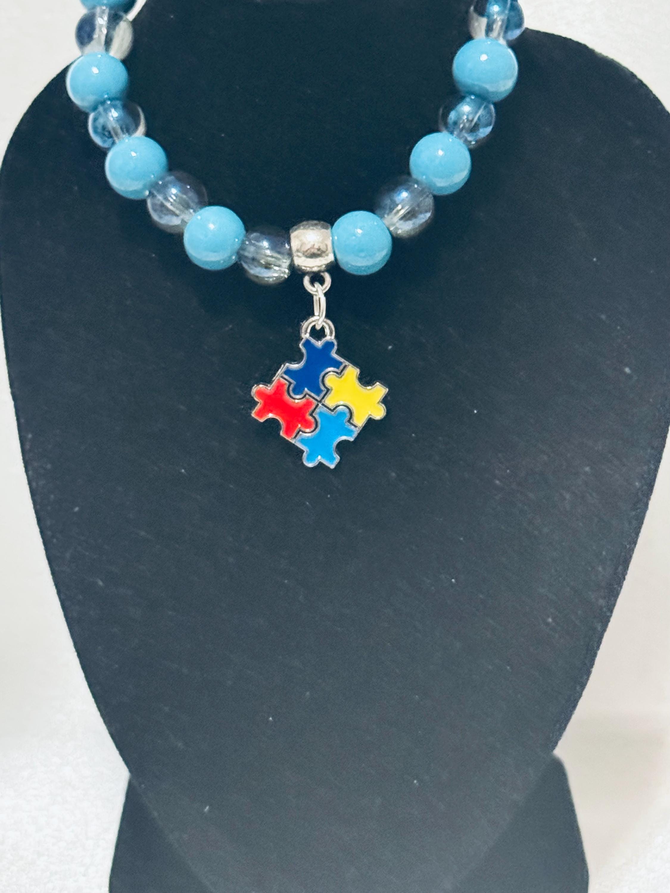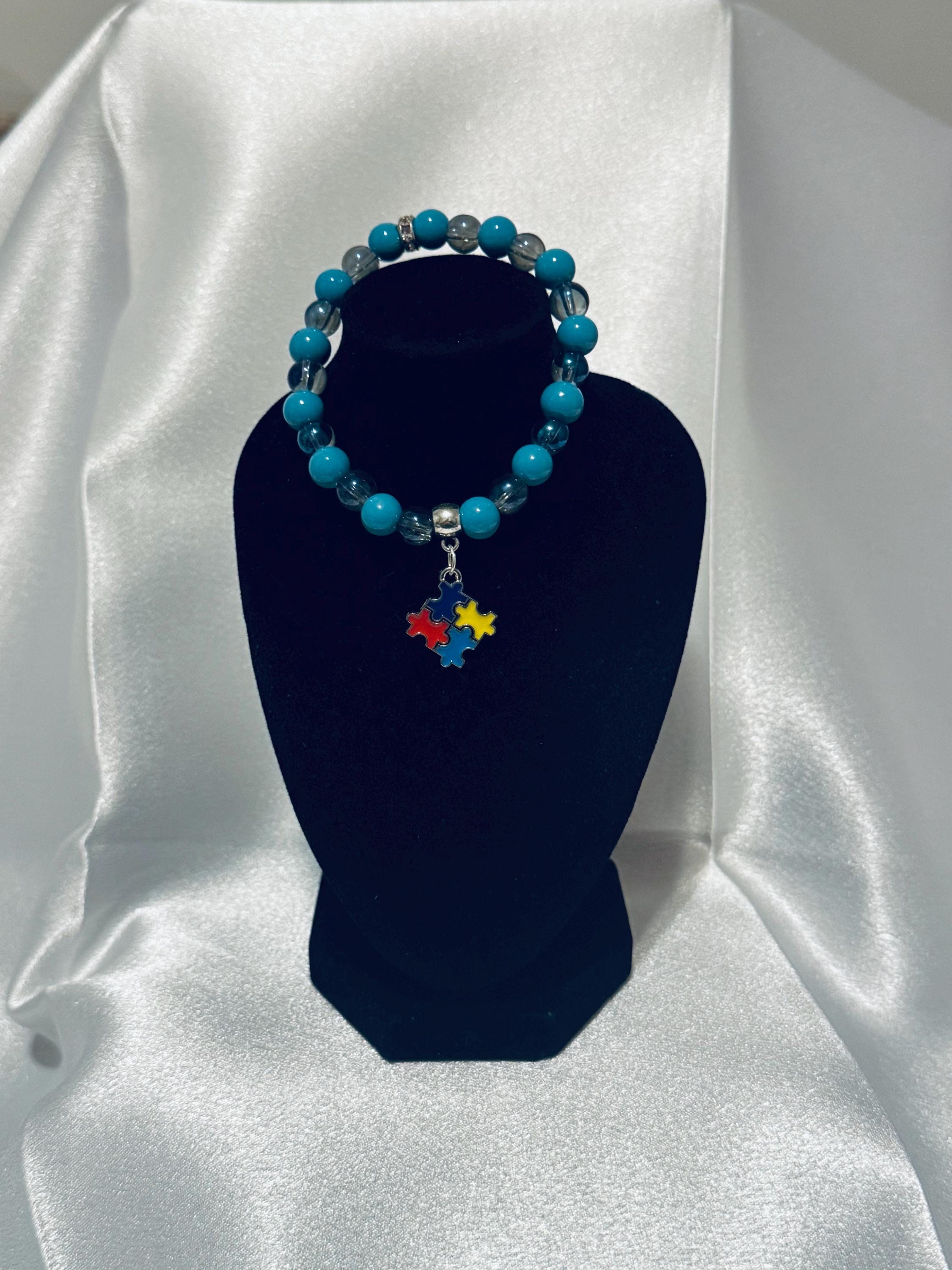 🧩 Show your support for Autism Awareness with this stretch acrylic and glass beaded charm bracelet.