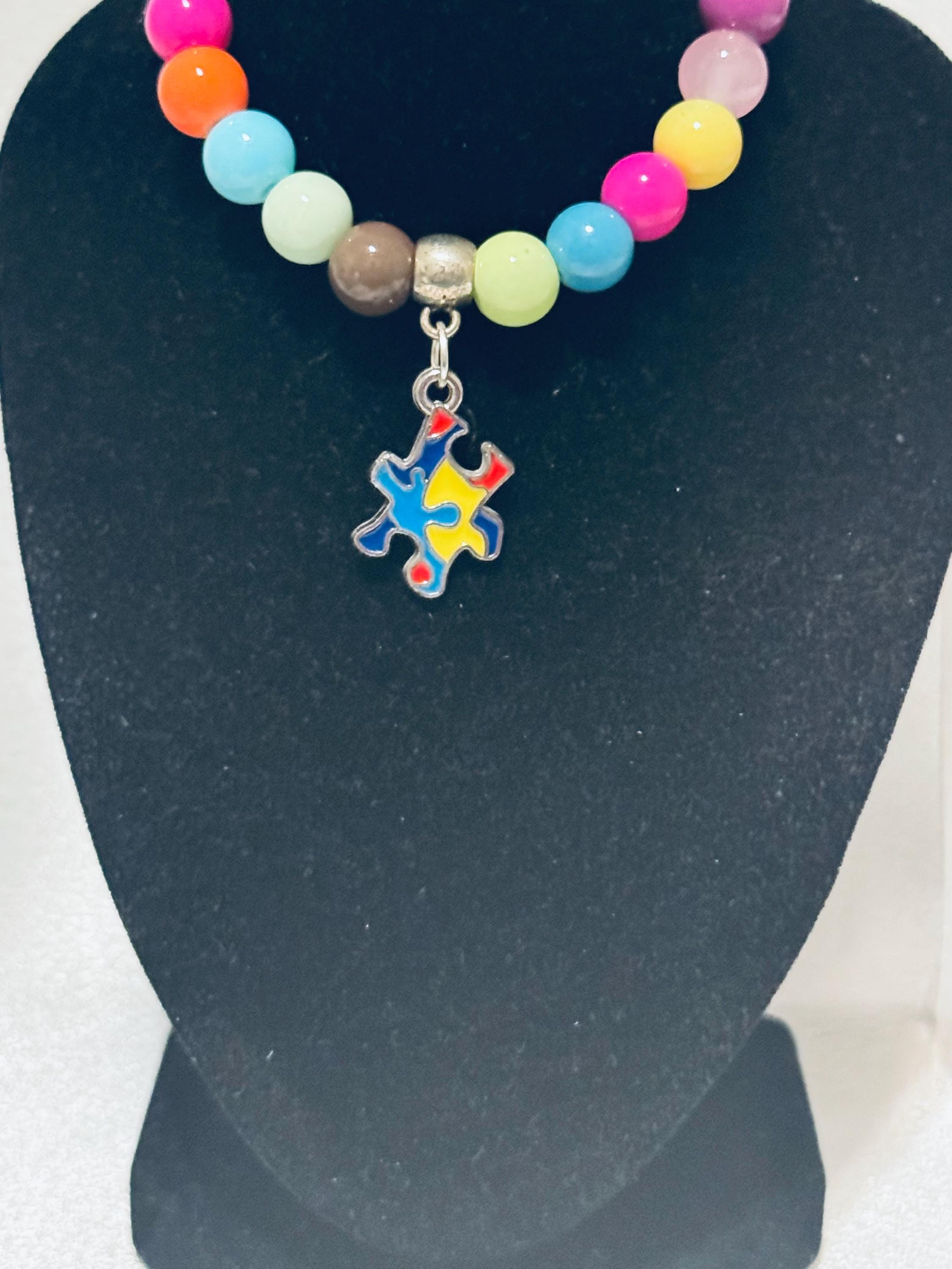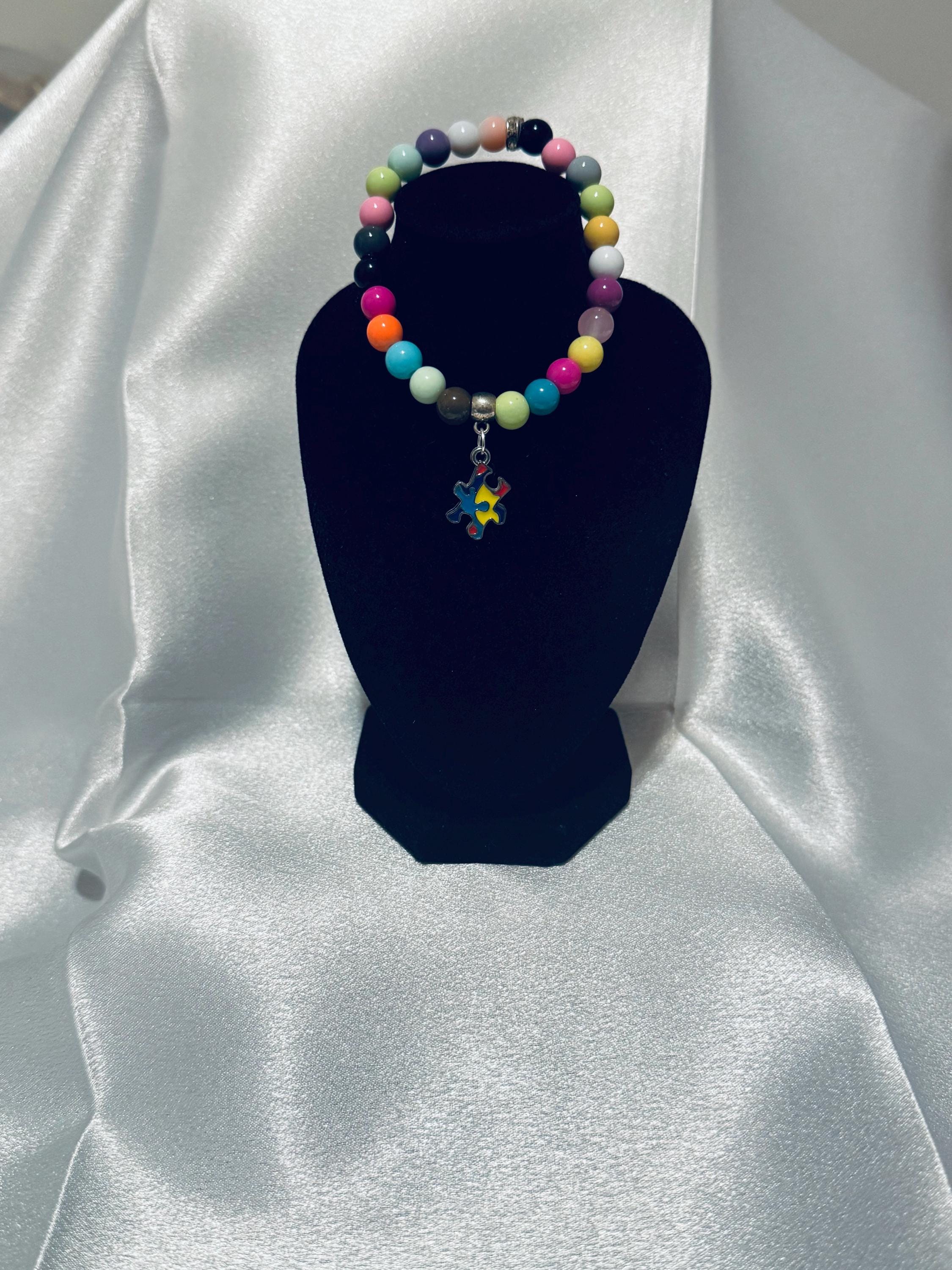 🧩 Show your support for Autism Awareness with this stretch acrylic and glass beaded charm bracelet.