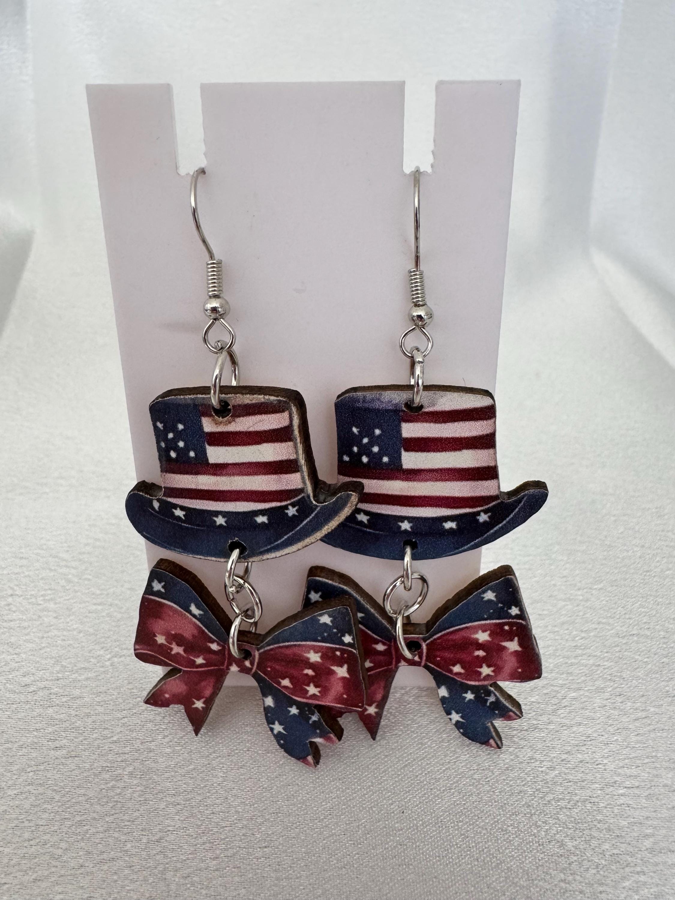 Celebrate American pride with these adorable wooden‑style dangle earrings—perfect for military families, patriotic holidays, or adding a rustic red, white, and blue touch to your everyday look. Designed to be hypoallergenic, they’re safe, gentle, and comfortable for sensitive ears while offering a lightweight, stylish finish.