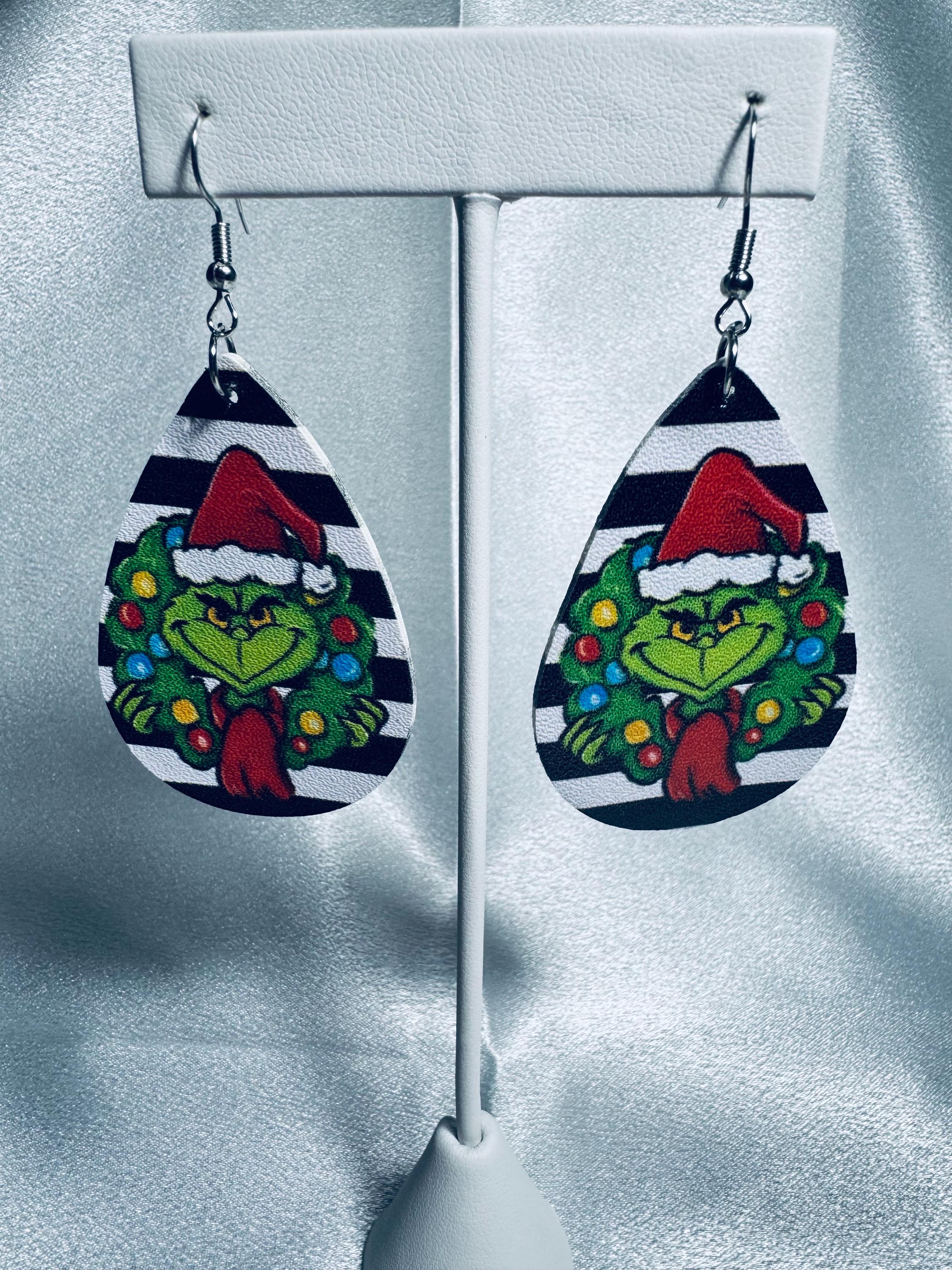 Add a mischievous touch of holiday cheer to your outfits with these playful leather Grinch‑themed dangle earrings. Lightweight, festive, and full of personality, they measure approximately 3 inches—bold enough to stand out while still comfortable for all‑day wear.