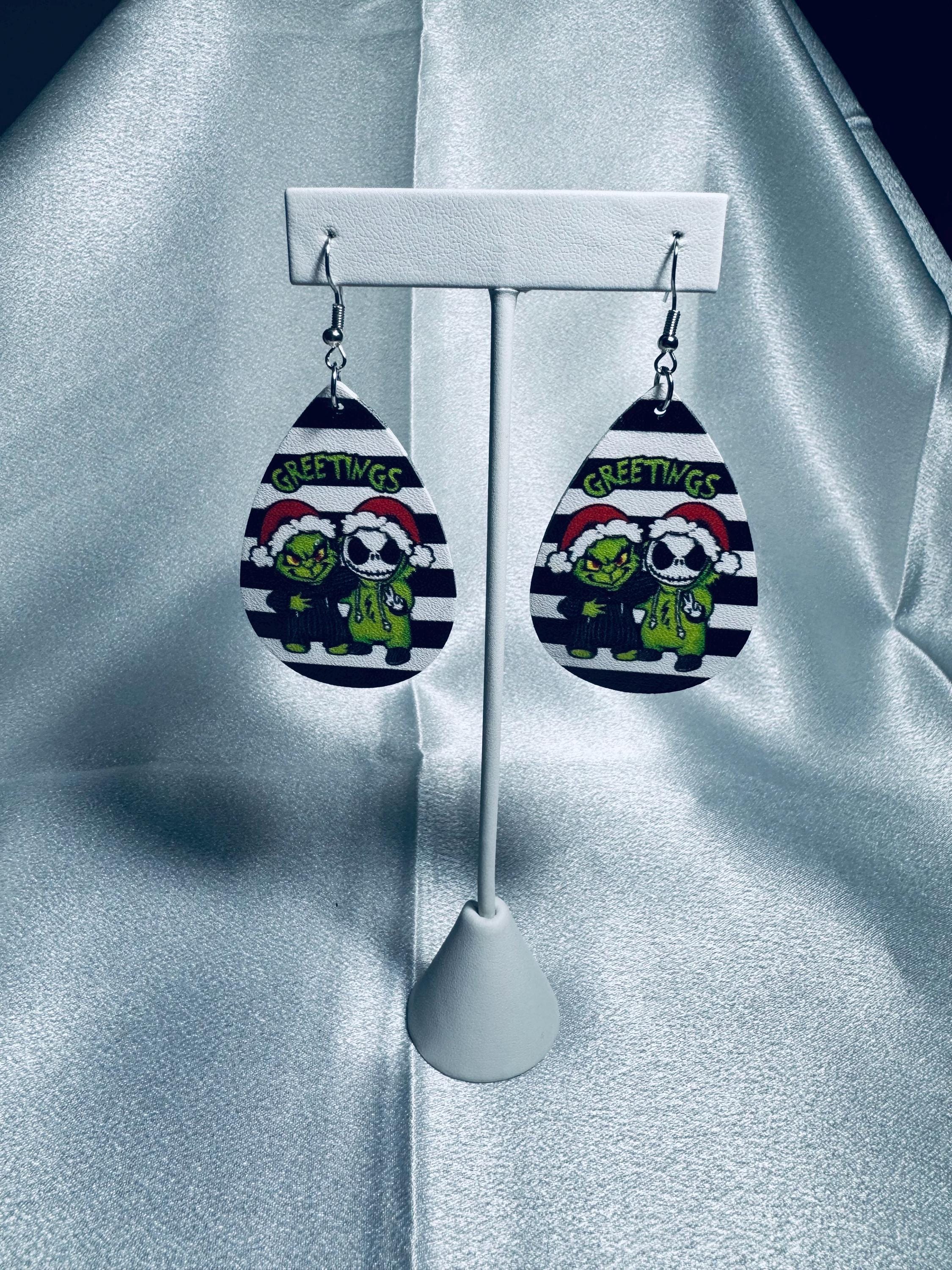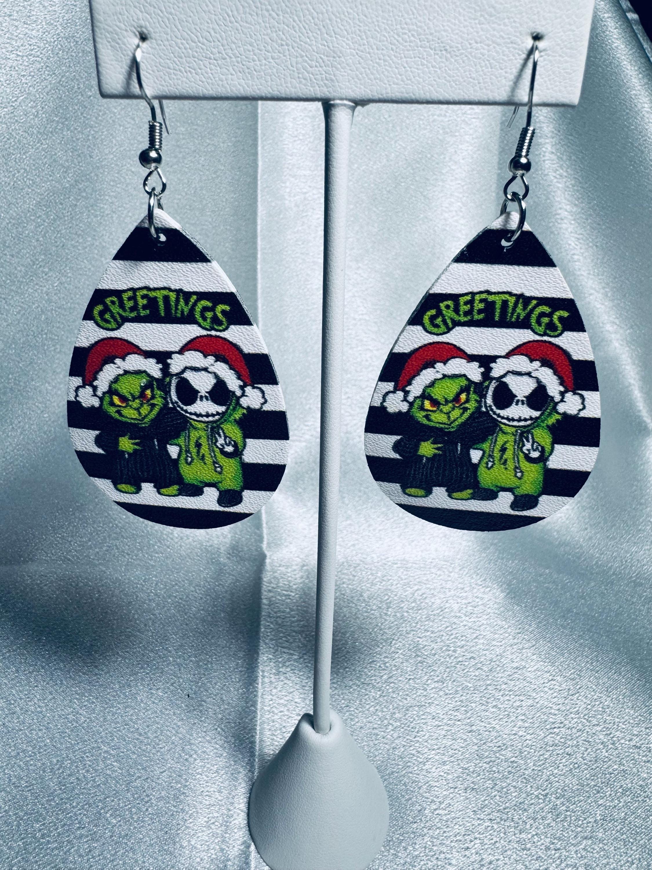 Add a mischievous touch of holiday cheer to your outfits with these playful leather Grinch‑themed dangle earrings. Lightweight, festive, and full of personality, they measure approximately 3 inches—bold enough to stand out while still comfortable for all‑day wear.