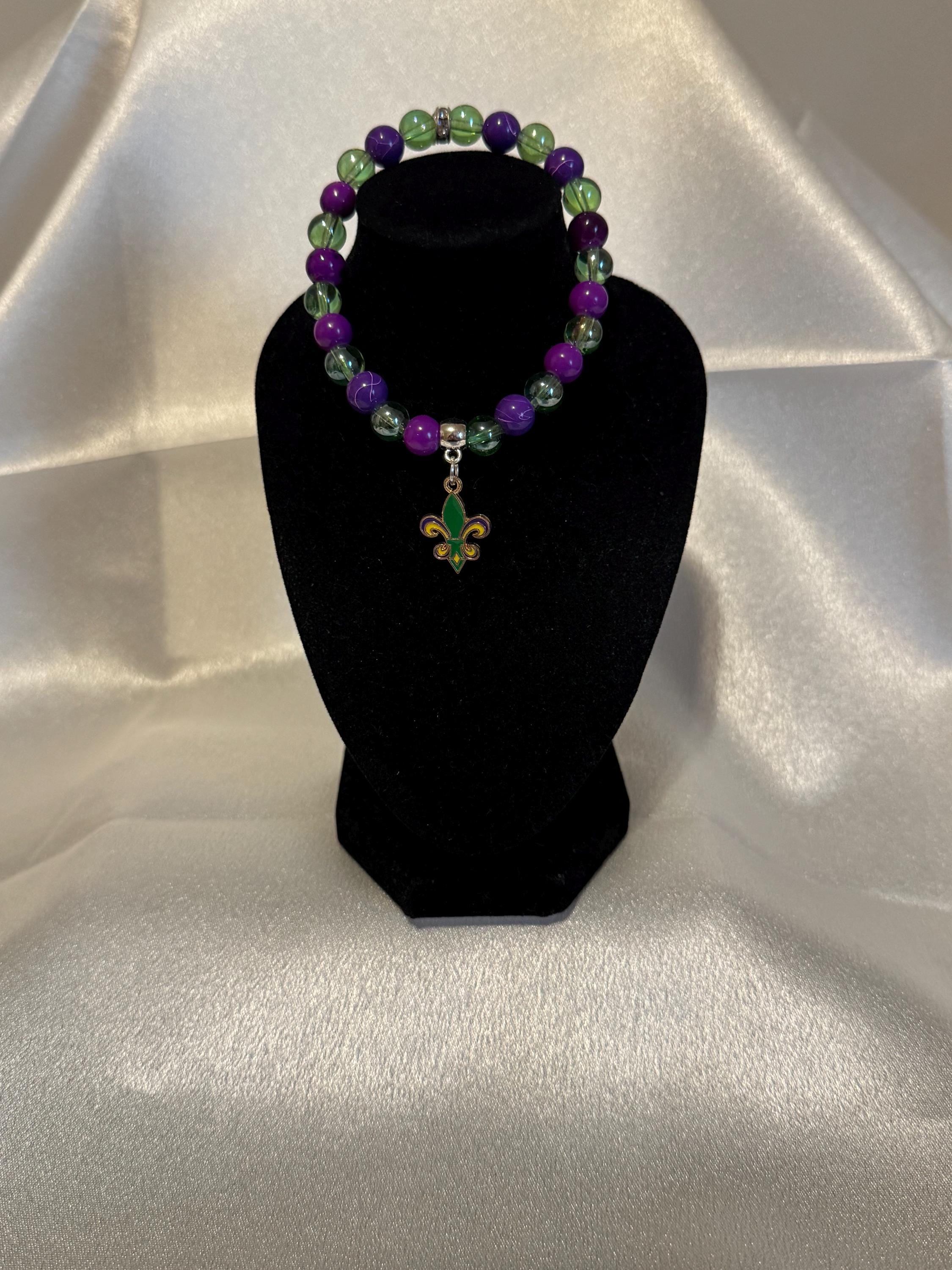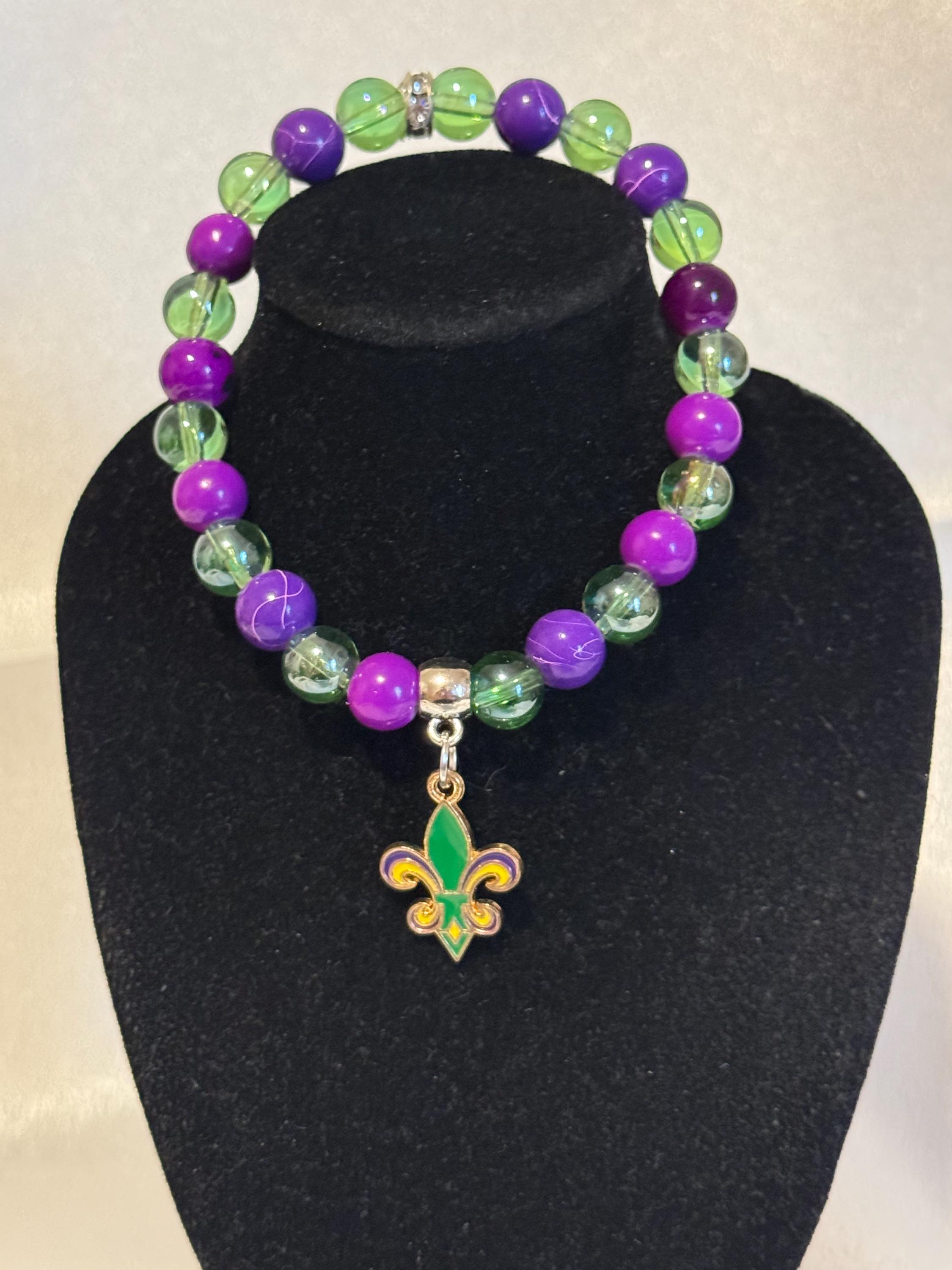 Add a festive touch to your outfit with this handmade Mardi Gras stretch bracelet, featuring vibrant acrylic and glass beads along with charming themed accents. Perfect for parties, parades, or everyday wear, this bracelet offers a comfortable fit with an average size of 7.5 inches.