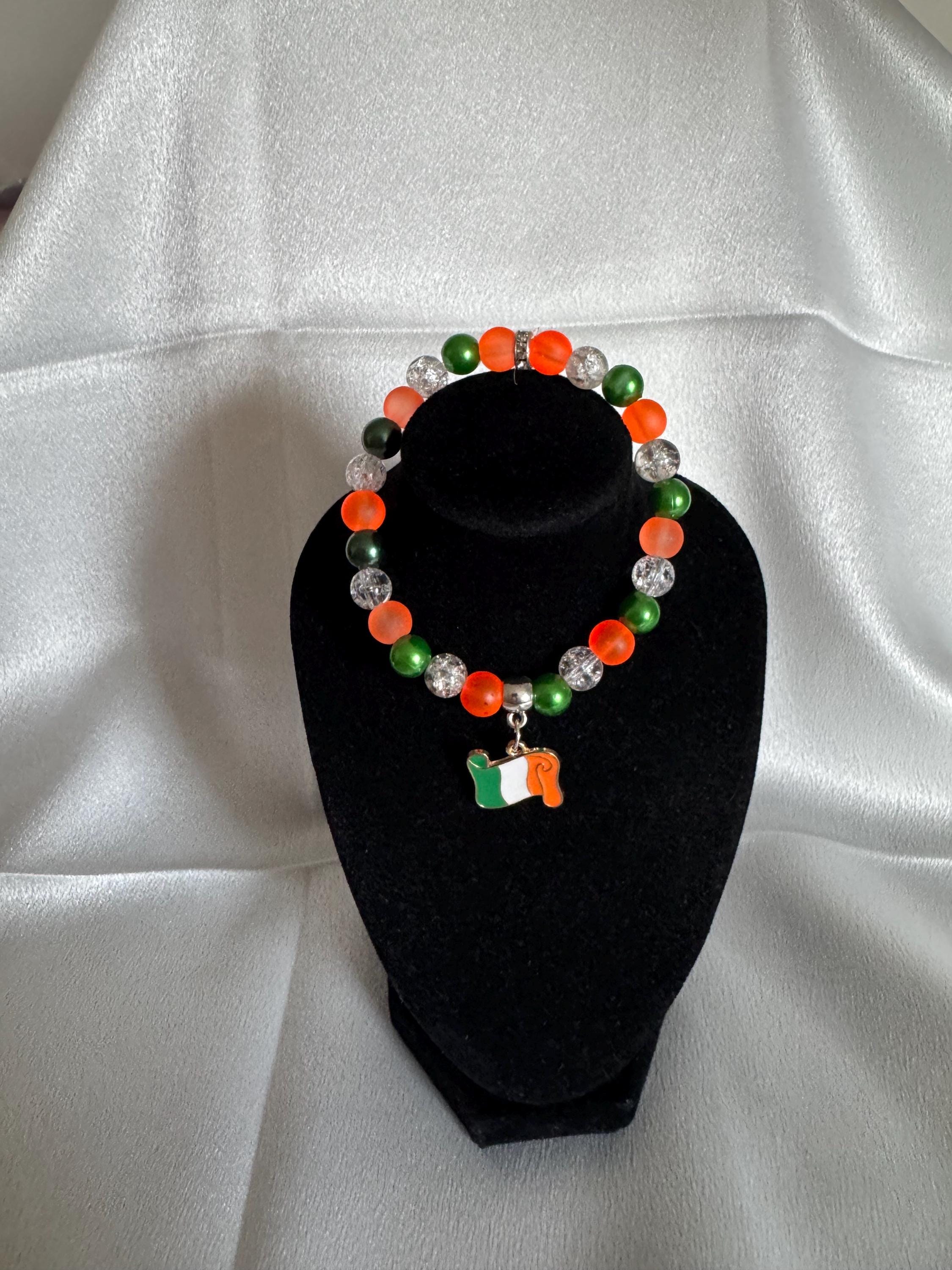 Celebrate St. Patrick’s Day—or your everyday love for Irish charm—with this handmade stretch bracelet featuring vibrant acrylic and glass beads paired with a festive themed charm. Measuring approximately 7.5 inches, it offers a comfortable fit and can be customized in both size and color to match your style.