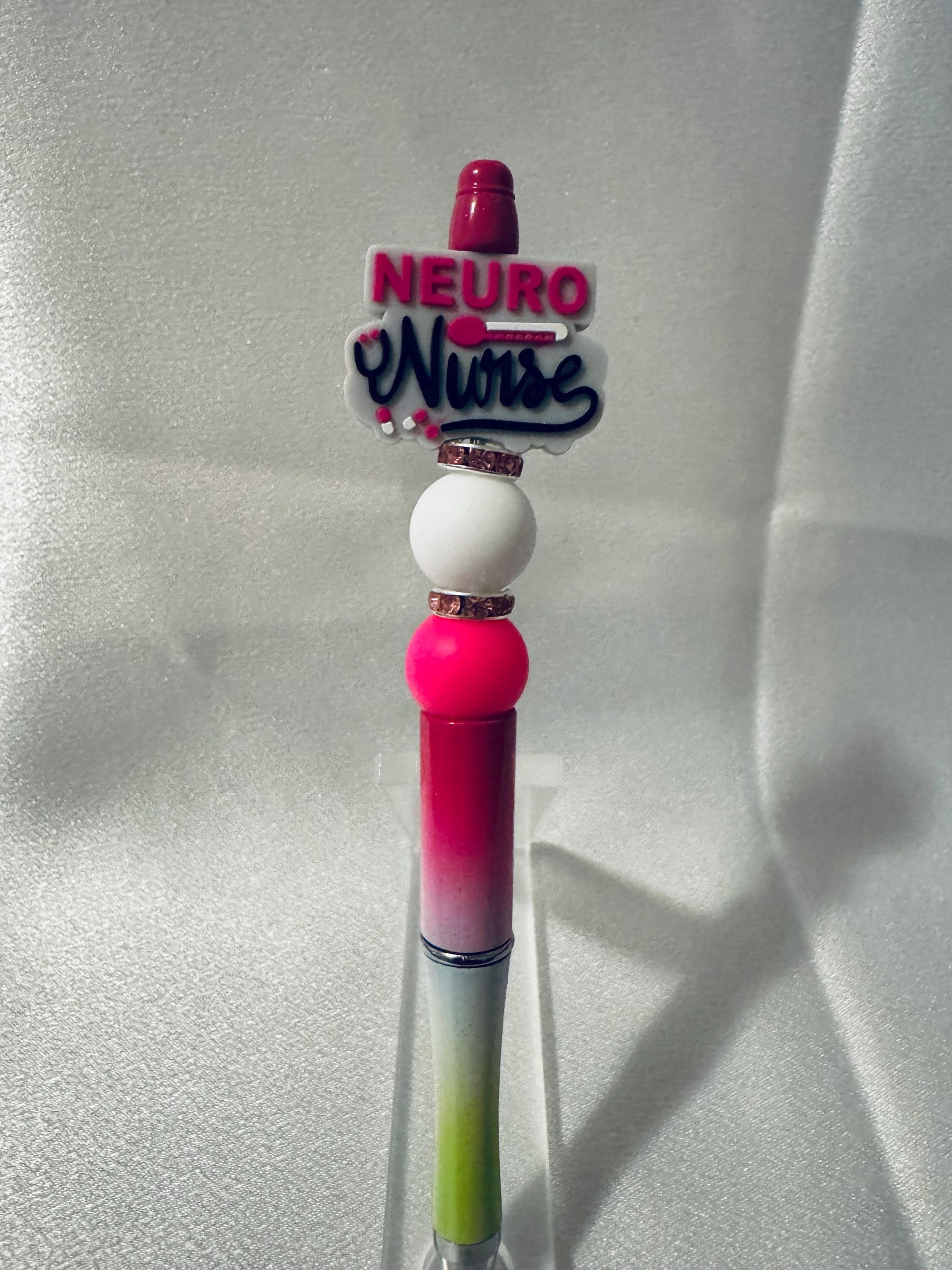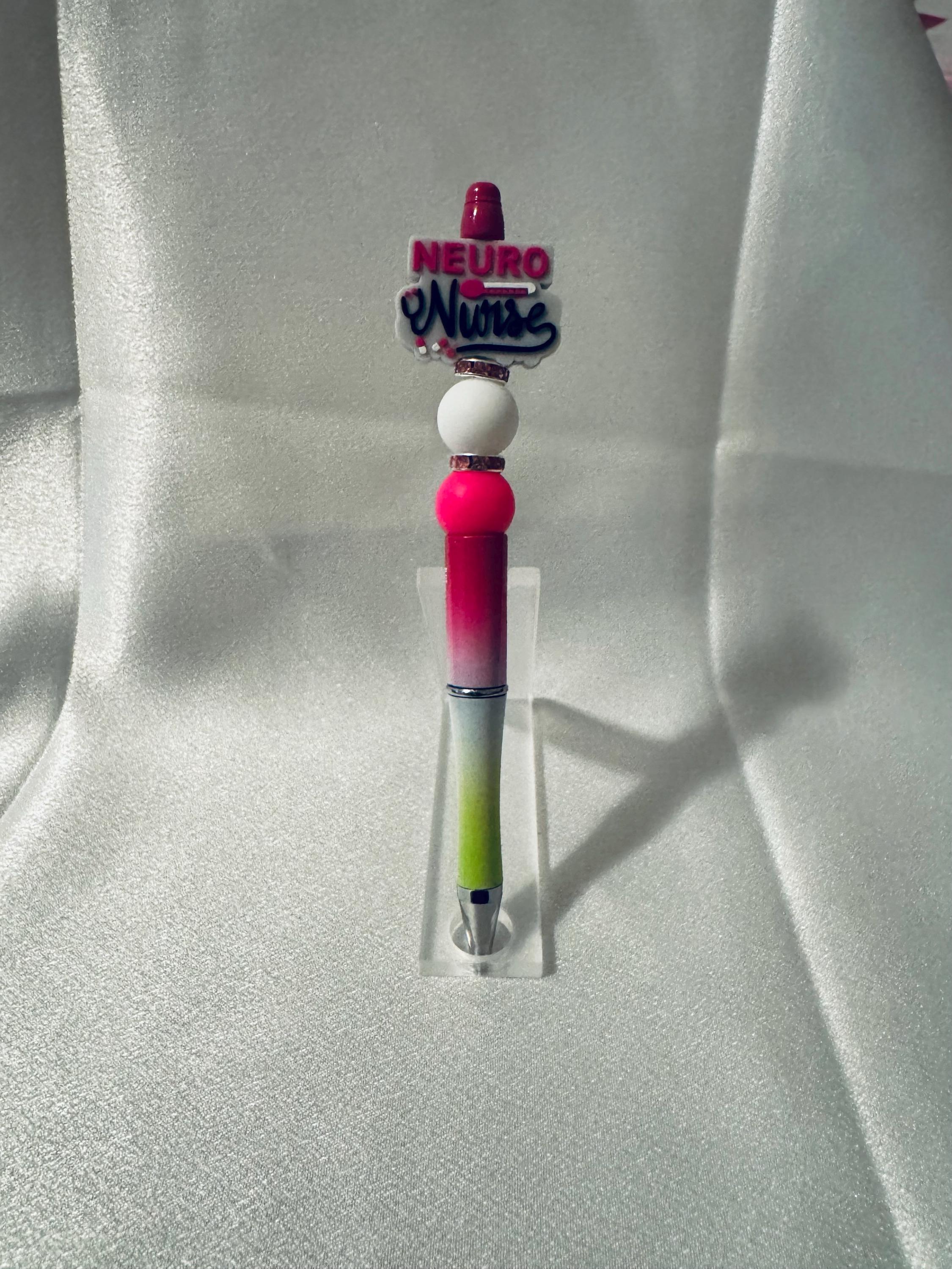 Silicone beaded writing pen featuring a nurse-themed focal bead, designed to celebrate the heart of caregiving. Made with smooth, soft-touch silicone beads for a comfortable grip and finished with a secure metal pen base. A thoughtful and practical gift for nurses, nursing students, or healthcare heroes.