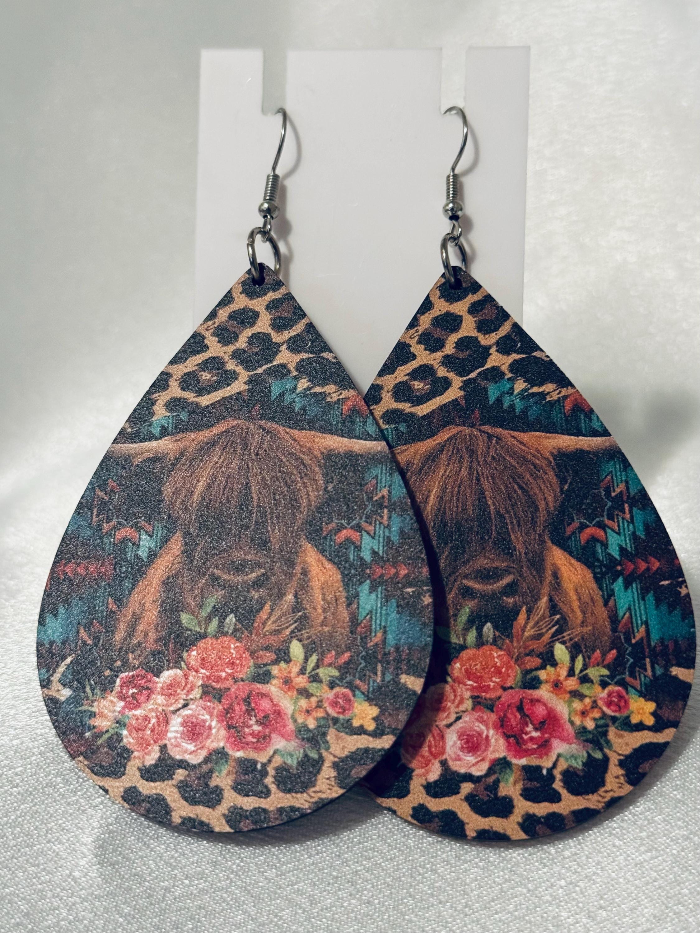 Adorable 2.75-inch long wooden teardrop earrings featuring a sweet Highland cow with floral accents and trendy leopard print details. Lightweight with hypoallergenic hooks—perfect for sensitive ears and everyday country-chic style. 🐮🌸🤎