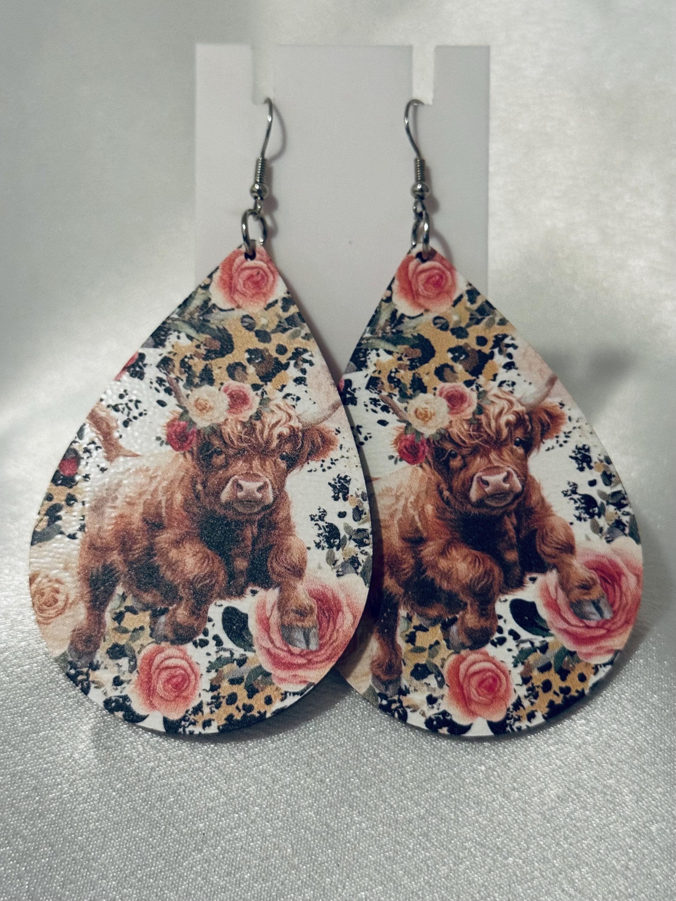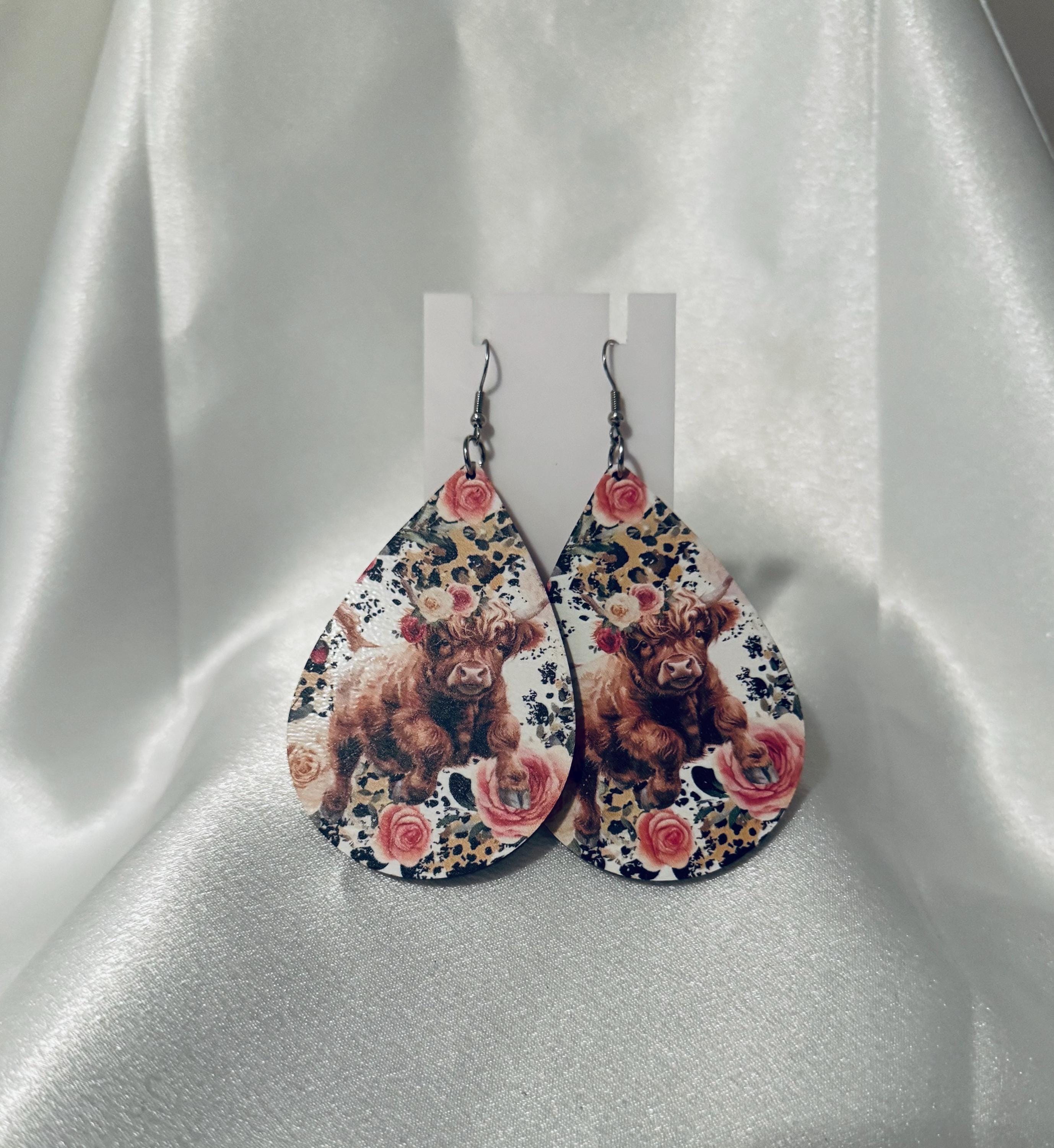 Adorable 2.75” wooden teardrop earrings featuring a sweet Highland cow surrounded by soft florals and a touch of leopard print. Lightweight with hypoallergenic hooks—perfect for sensitive ears and country-chic style. 🐮🌸🤎