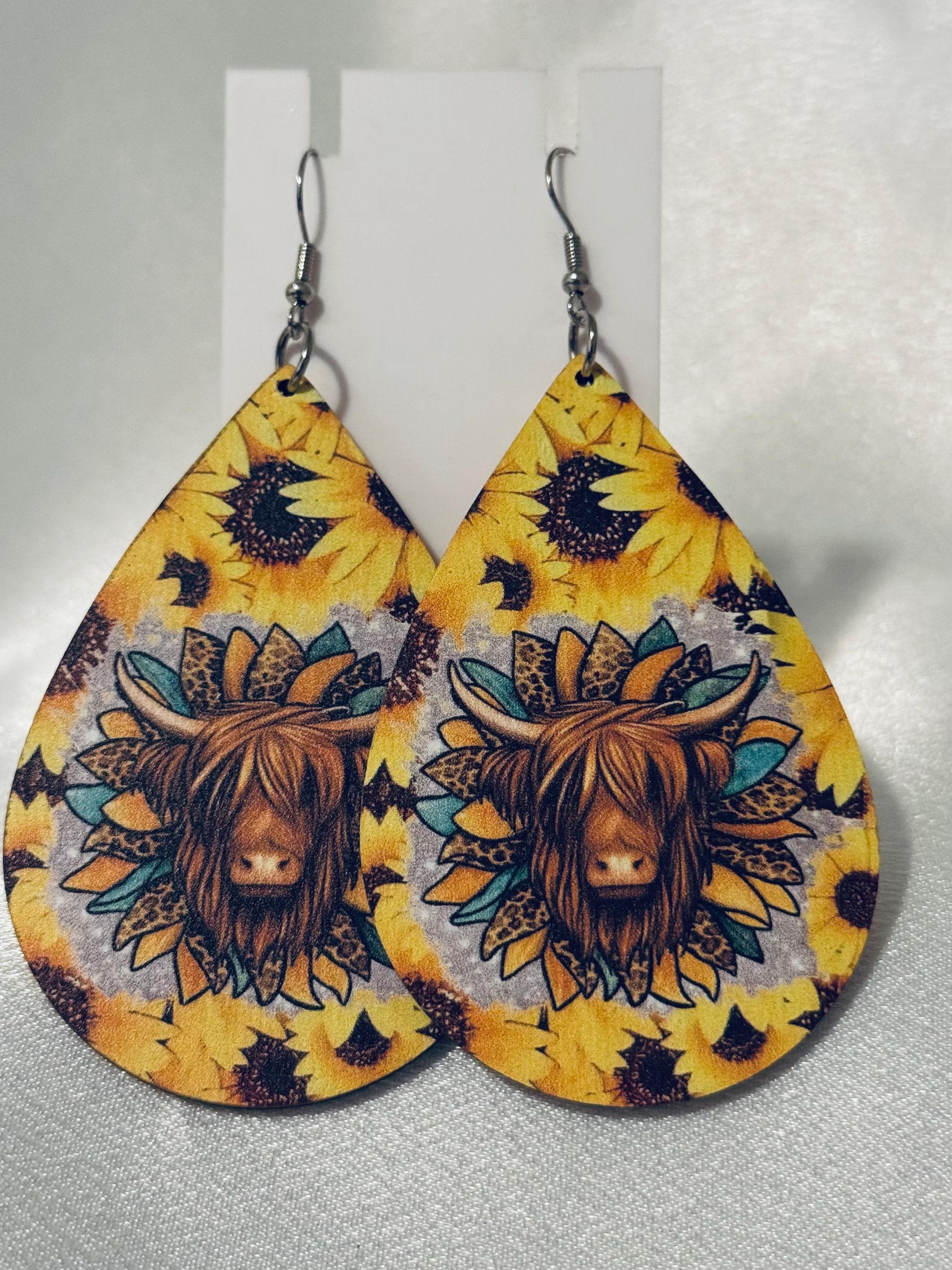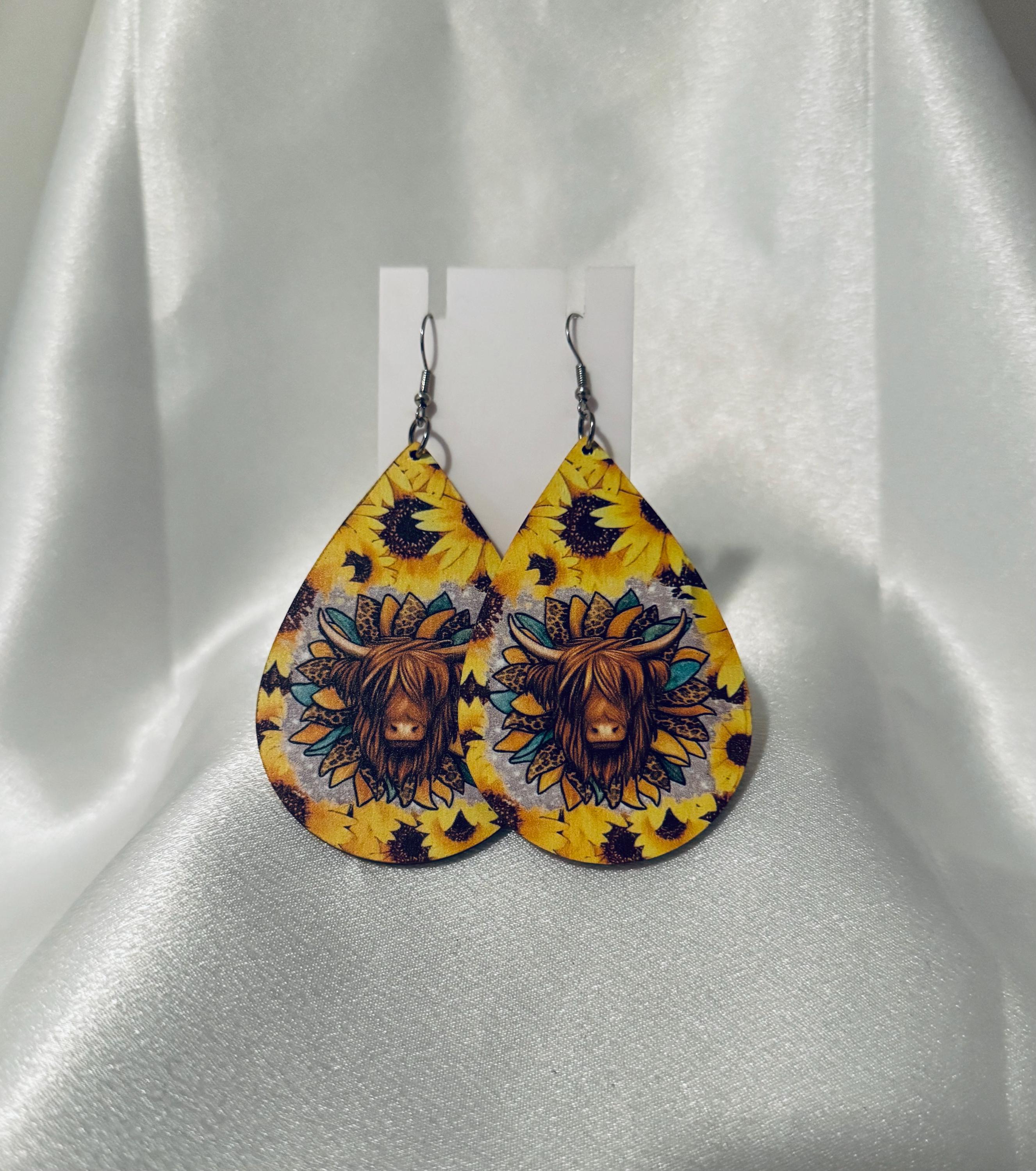 Bright and bold wooden teardrop earrings, 2.75 inches in length, featuring a sweet Highland cow framed by vibrant sunflowers. Lightweight with hypoallergenic hooks—perfect for sensitive ears and sunny, country-inspired style. 🌻🐮💛