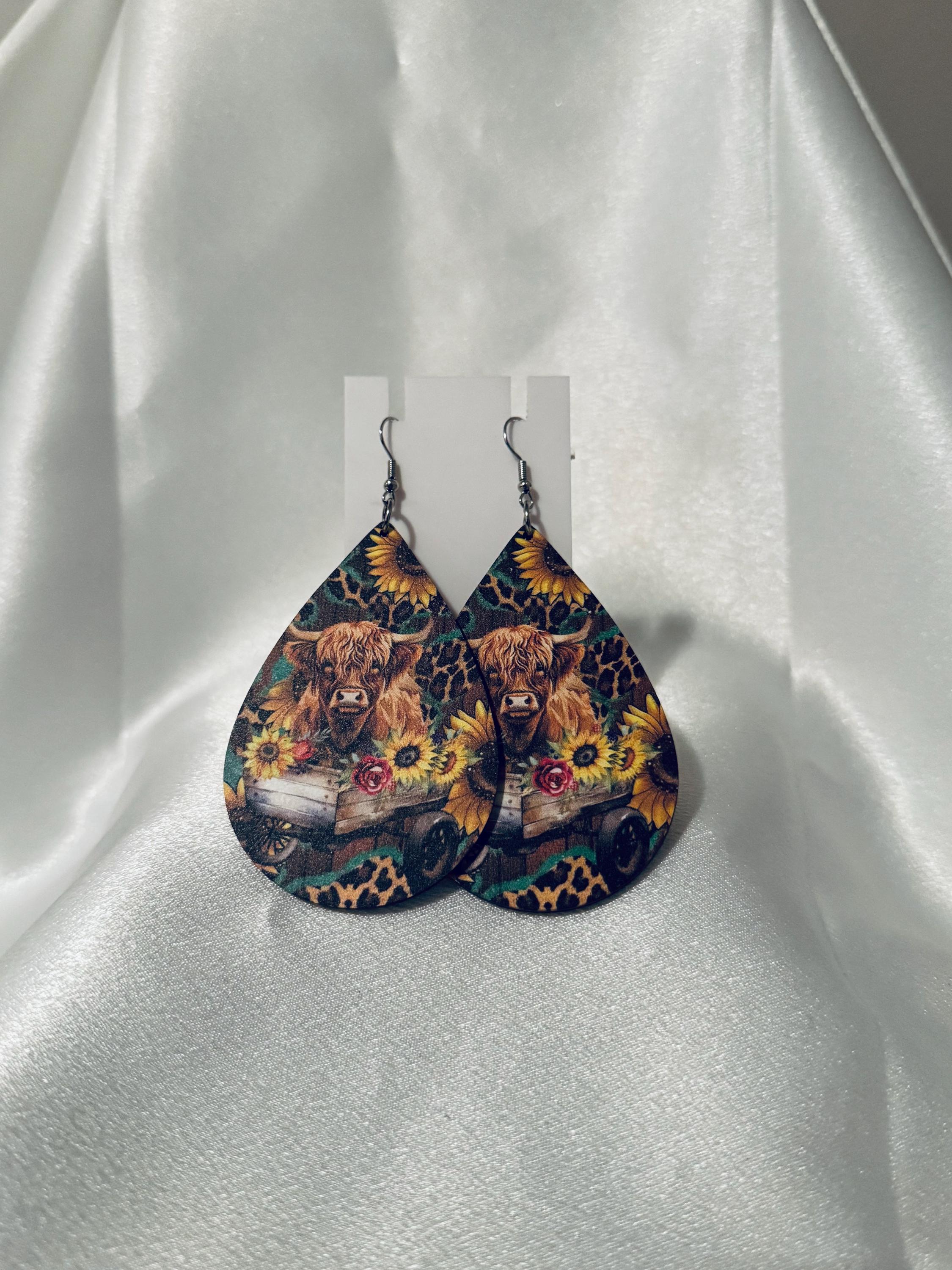 Adorable 2.75-inch wooden earrings featuring a sweet Highland cow, sunflowers, and rustic charm 🌻🐮 Lightweight with hypoallergenic hooks—perfect for sensitive ears and everyday country style! 💛