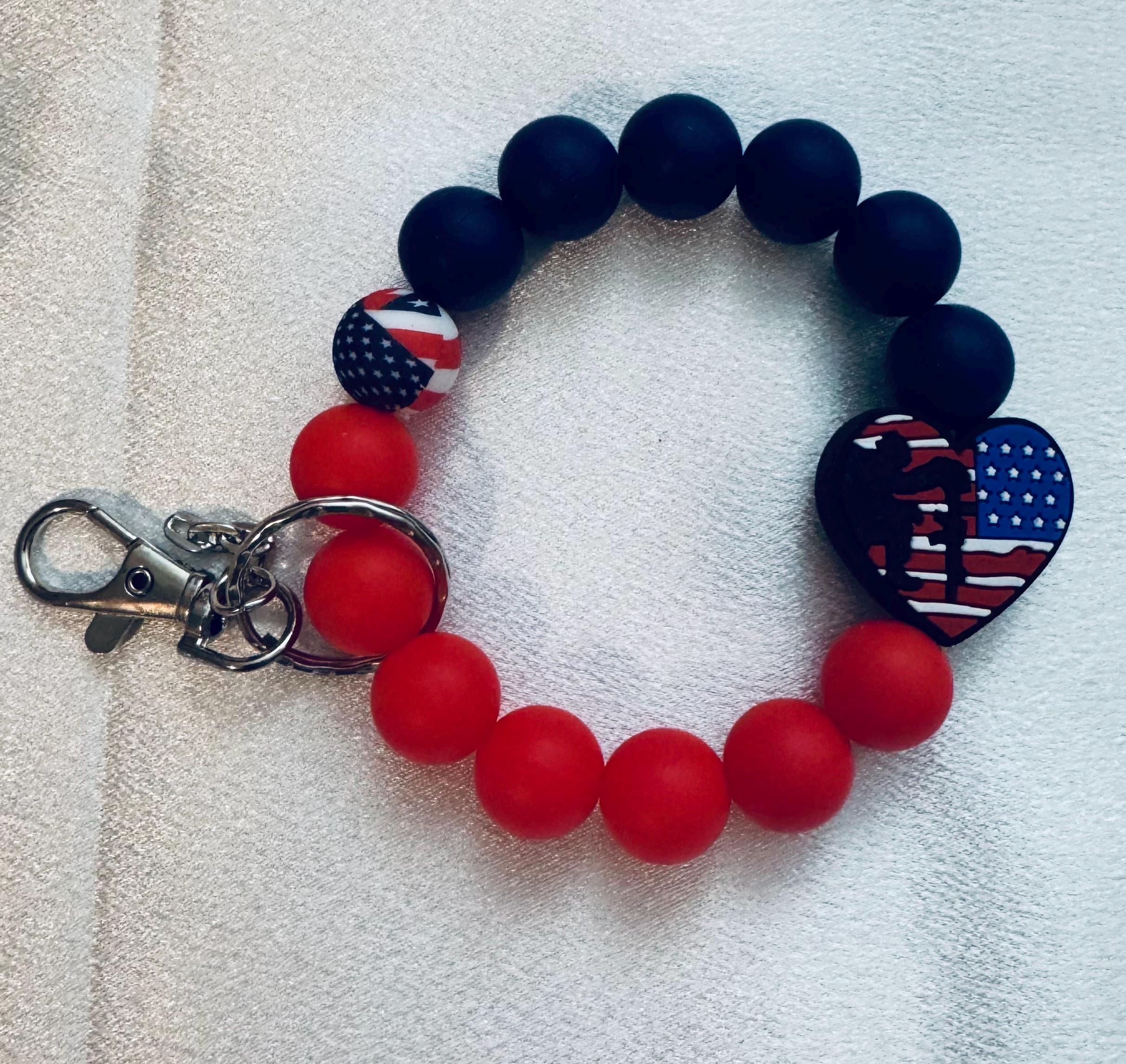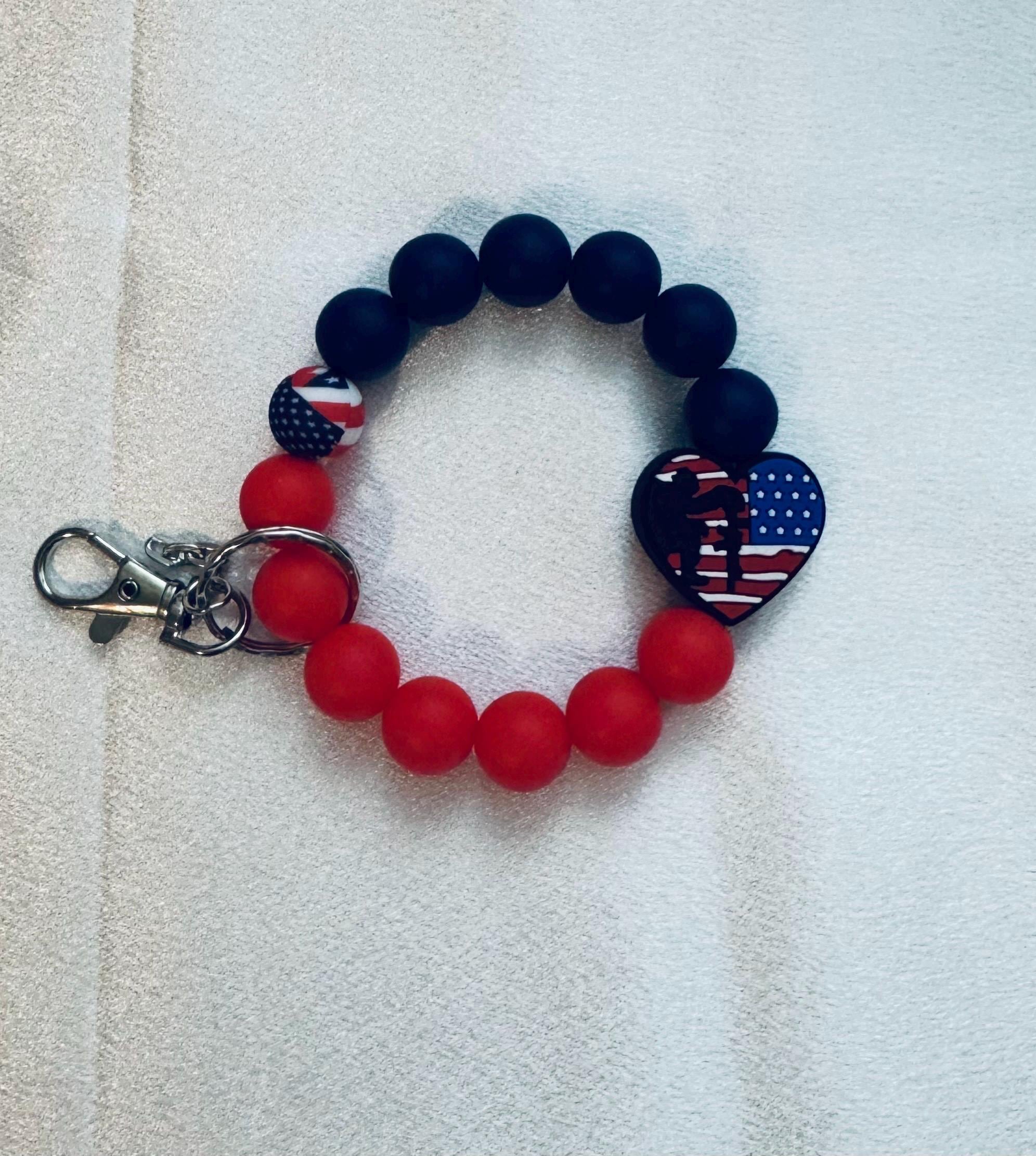 Featuring bold red, white, and blue designs with a fun USA focal bead, these wristlets are both stylish and practical. Made with durable silicone beads for a comfortable fit, they easily slip onto your wrist—perfect for keeping your keys close on the go!