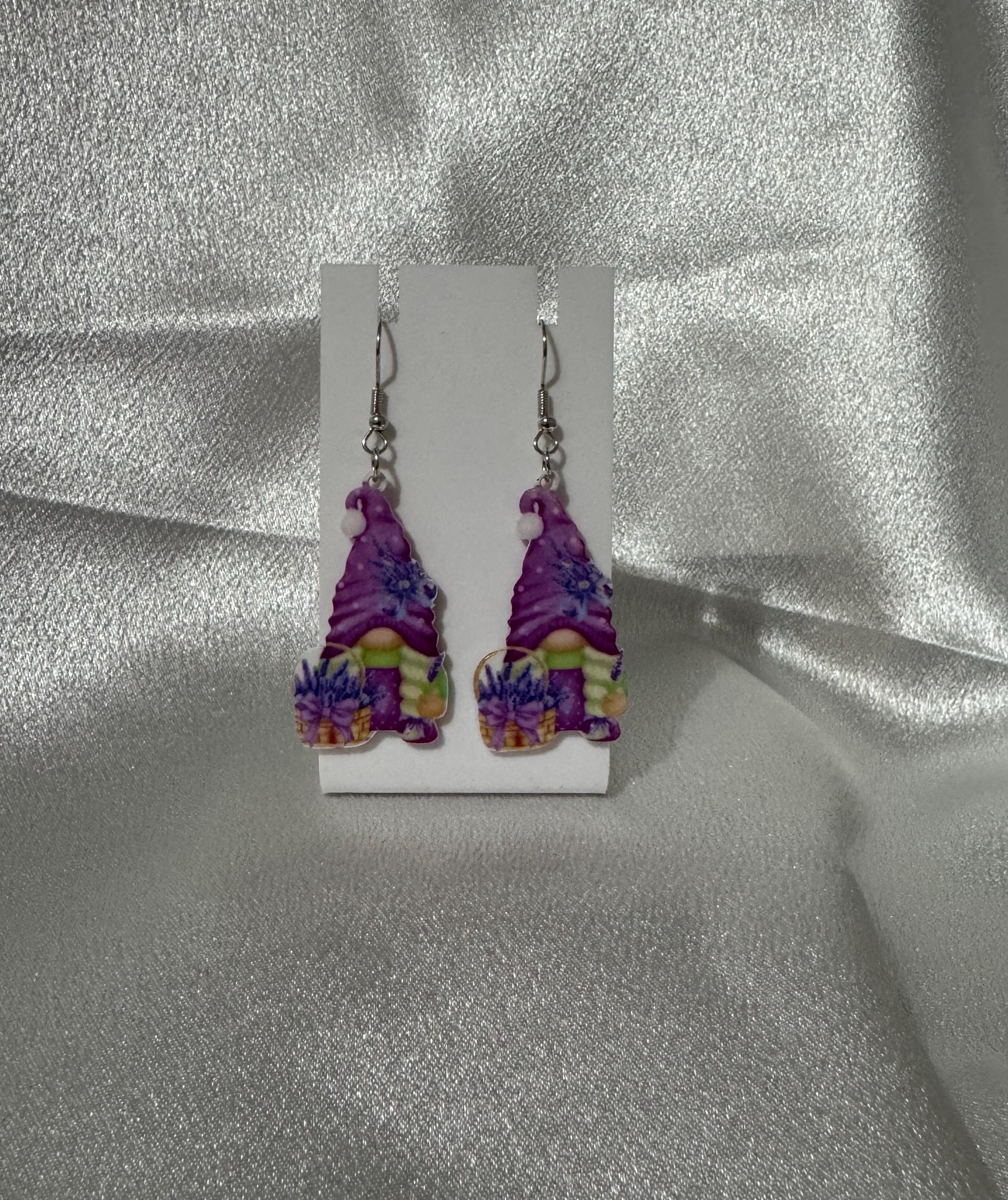 Spring Gnome Lavender Basket Dangle Earrings Hypoallergenic