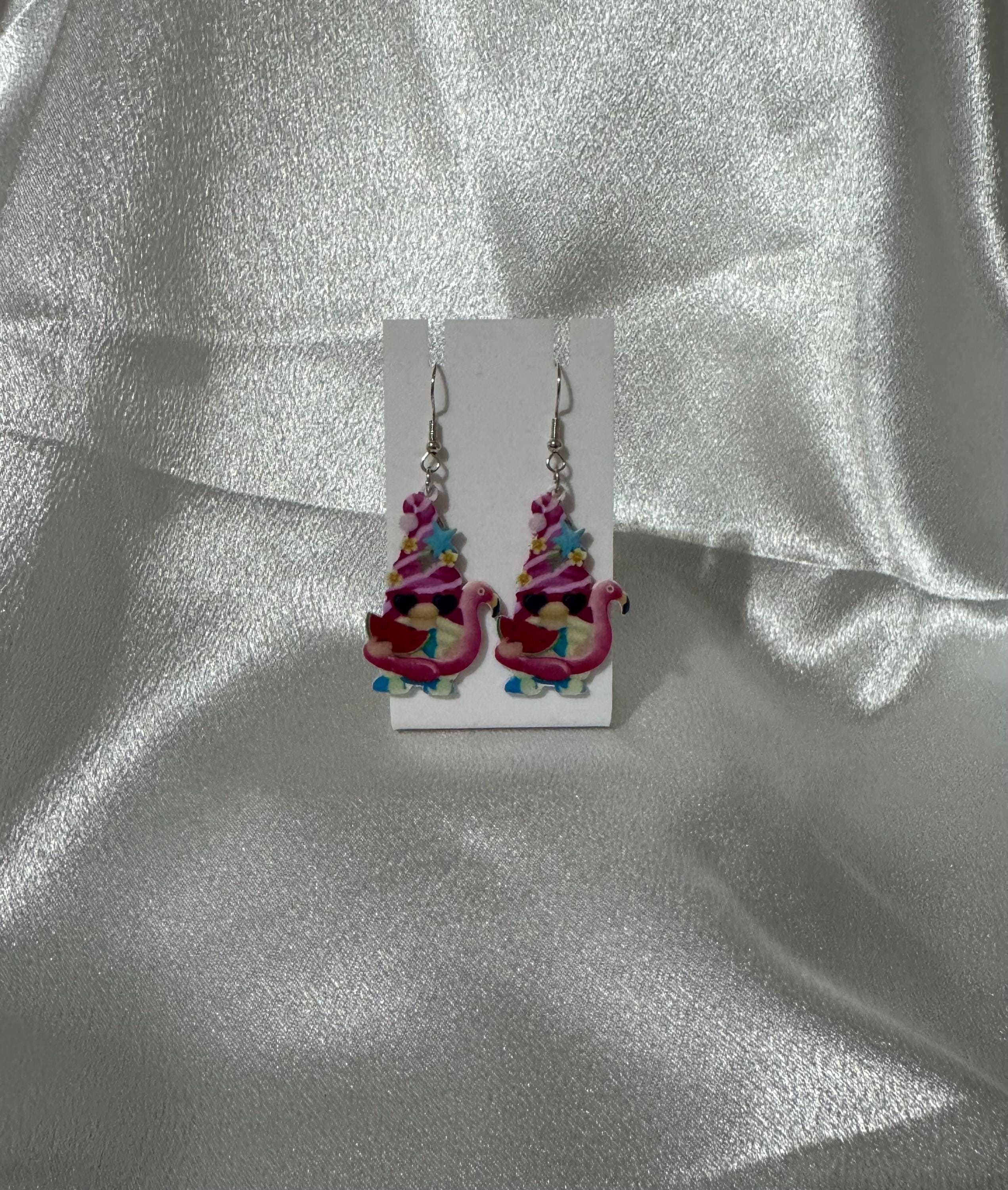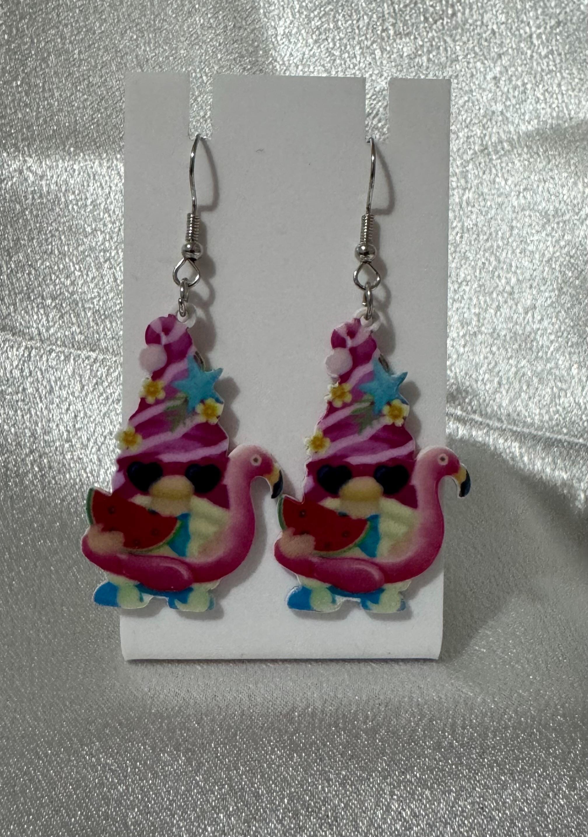 Spring Gnome Flamingo Earrings: Watermelon, Sunglasses, Hypoallergenic Dangle Jewelry